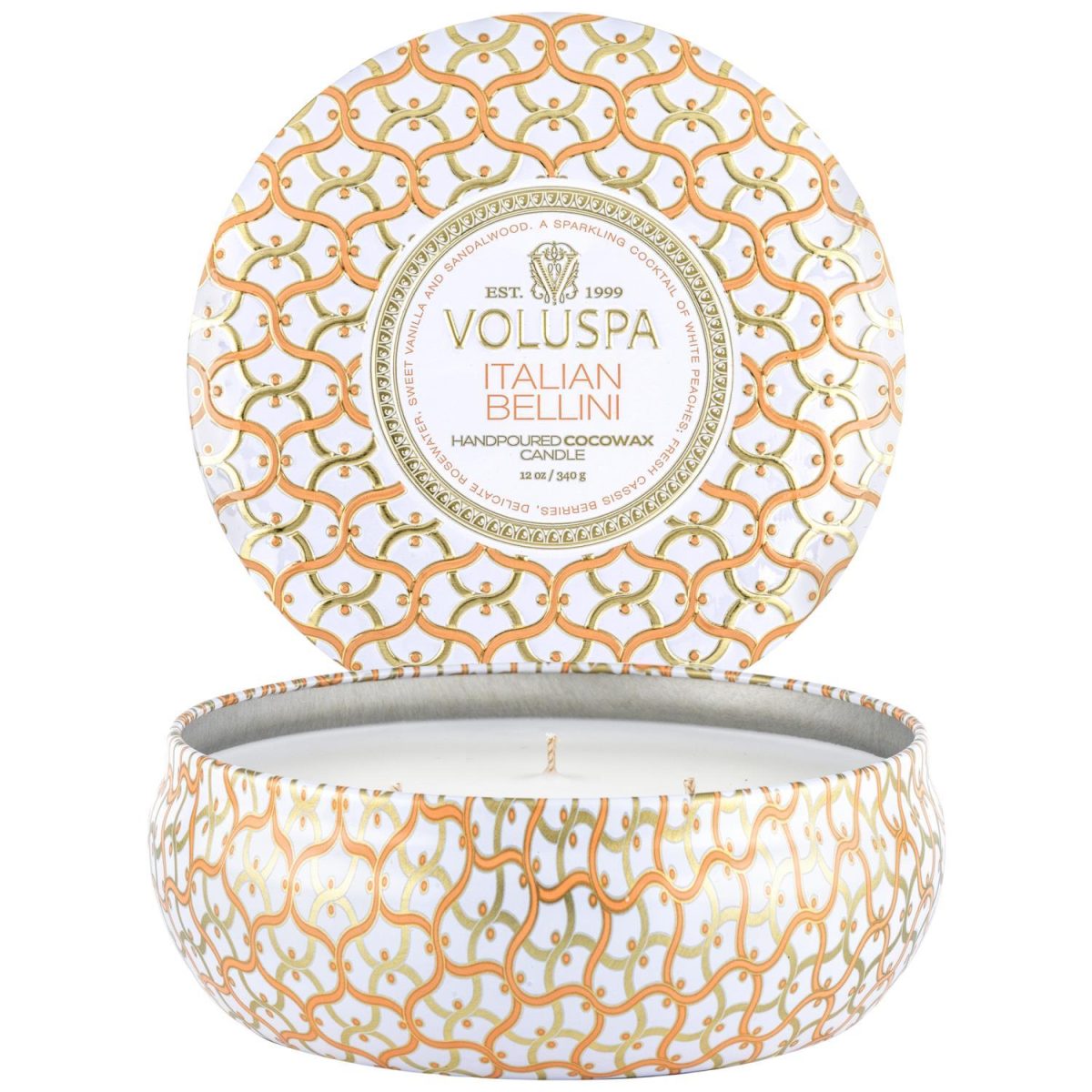 Duftlys i dekorativ metallboks med noter av hvit fersken, bær og rosevann, søt vanilje og sandeltre.