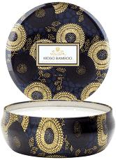 “Moso Bamboo 3-Wick tin Candle” fra Voluspa. Denne dufter av bambus, svart musk og japansk sypress. Kommer i en dekorativ stor tinnboks med lokk.
