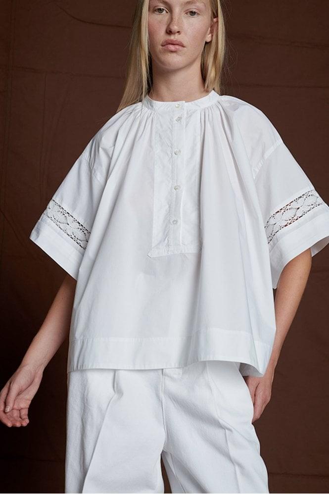 Vid a-formet bomullskjorte med vide, korte ermer. Skjorten har rund hals med smal krage, knapper ned til brystet og dekorative blondedetaljer på ermene.