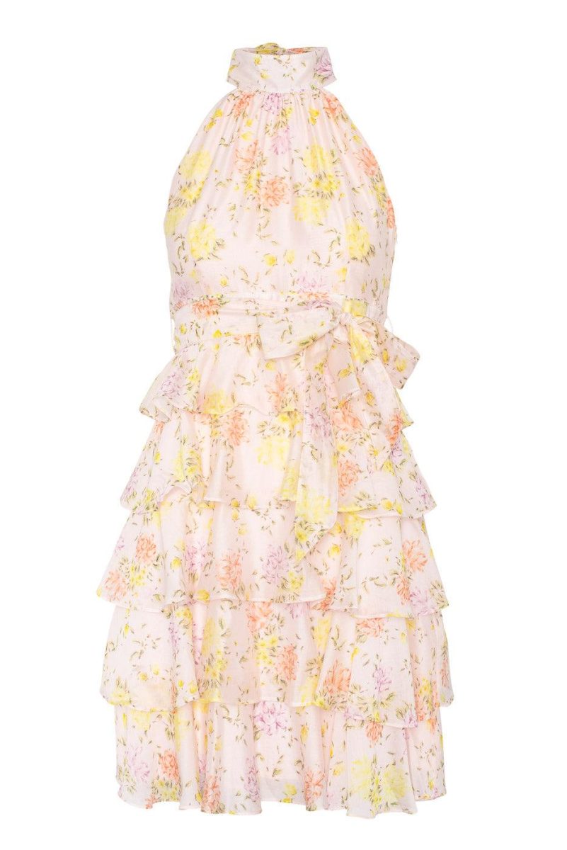 En romantisk minikjole med et delikat blomsterprint. Designet med en elegant halterneck og et flatterende knytebånd i midjen som fremhever silhuetten. Det lagdelte skjørtet med volanger tilfører leken bevegelse og skaper et feminint og blikkfangende uttrykk – perfekt til sommerfester, bryllup og spesielle anledninger.