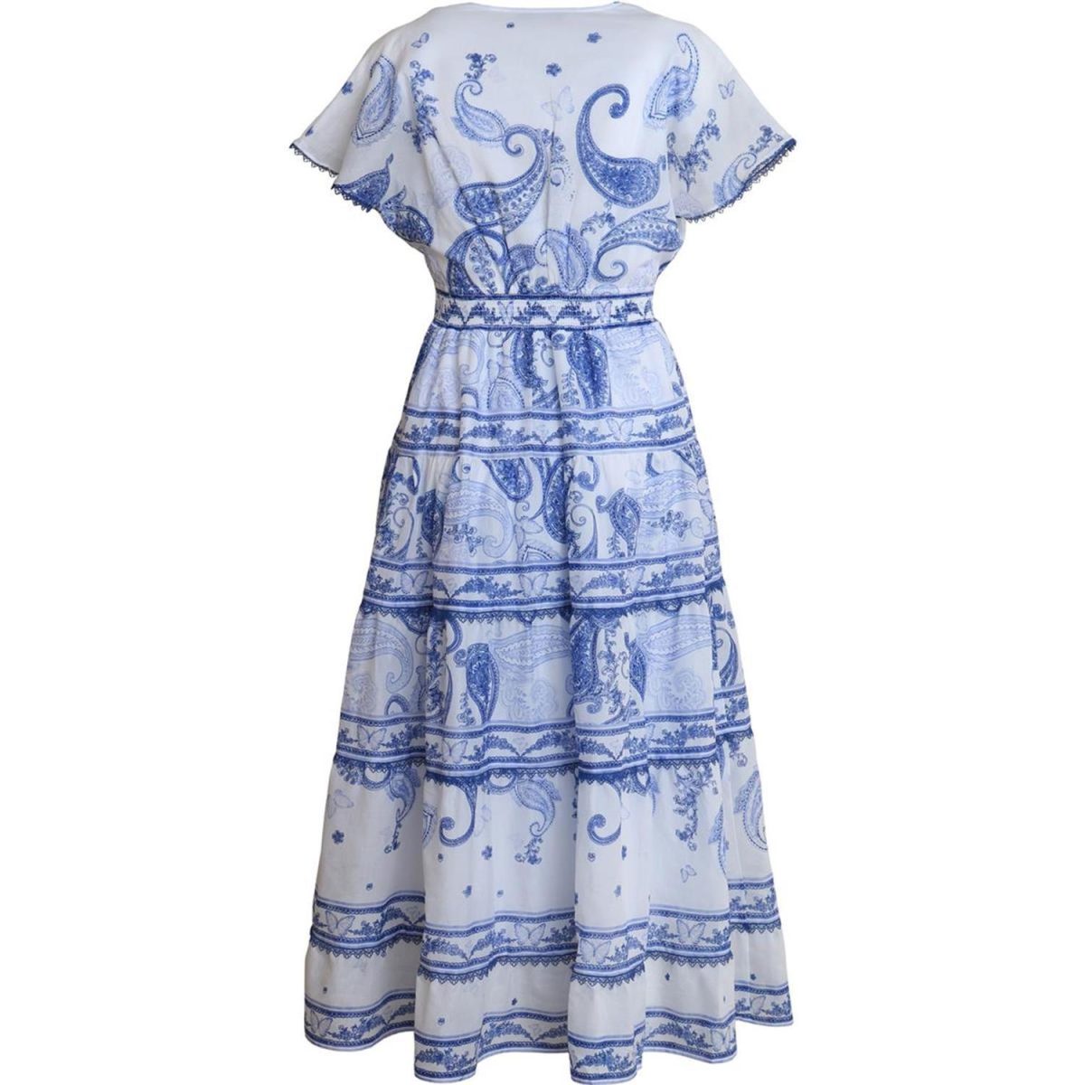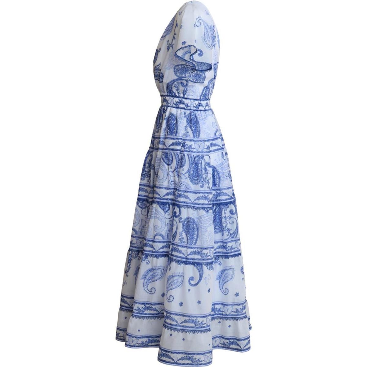 Elegant og feminin kjole fra Hale Bob i et delikat blått paisleymønster. Kjolen har en flatterende V-utringning og kort, luftige ermer som gir et lett og sommerlig uttrykk.