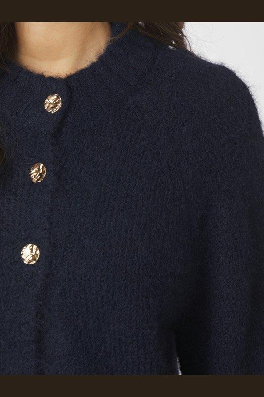 Kort cardigan med vide ermer og fine dekorative knapper øverst foran. Kvaliteten er myk med et fluffy utseende. Modellen er 176 cm høy og bruker størrelse 36.