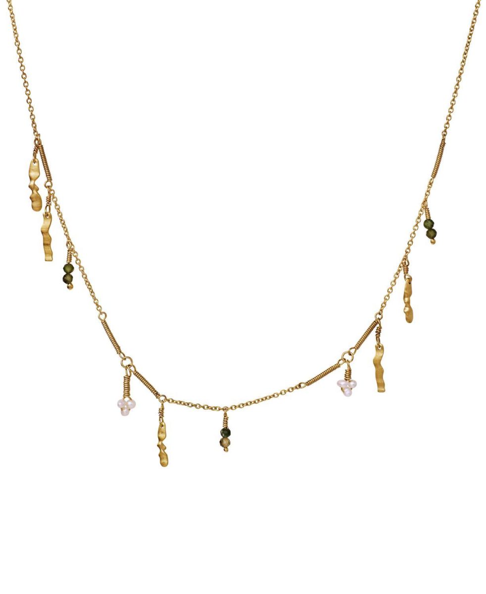 Vridde elementer blandes med små klynger av ferskvannsperler og grønn turmalin i det fine Bergdis-kjedet. Det sies at grønn turmalin gir livsglede og åpner for muligheten til å sette pris på de mange opplevelsene og gledene livet bringer.