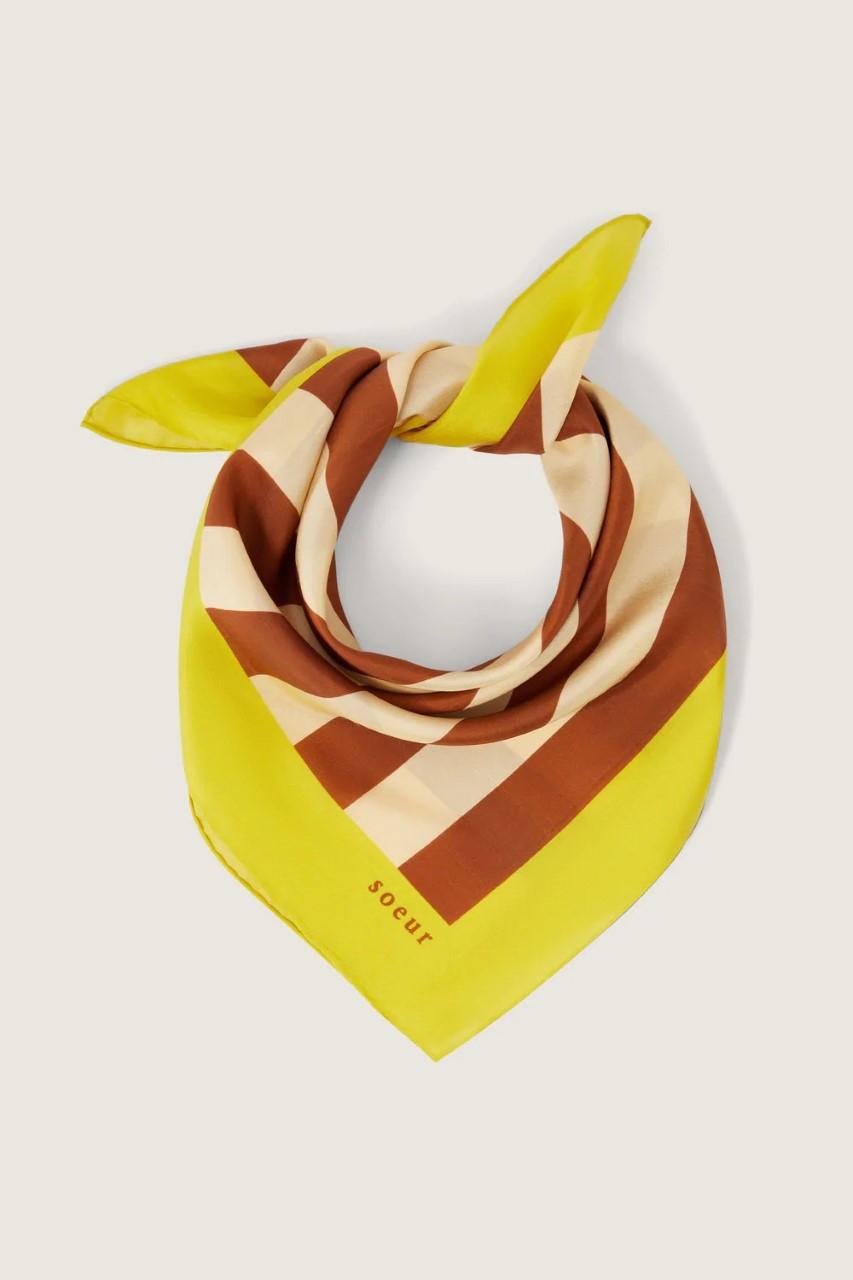 Lekkert skjerf i gul og bruntoner. Skjerfet er i 100% silke og er et lekkert tilbehør til ditt antrekk.