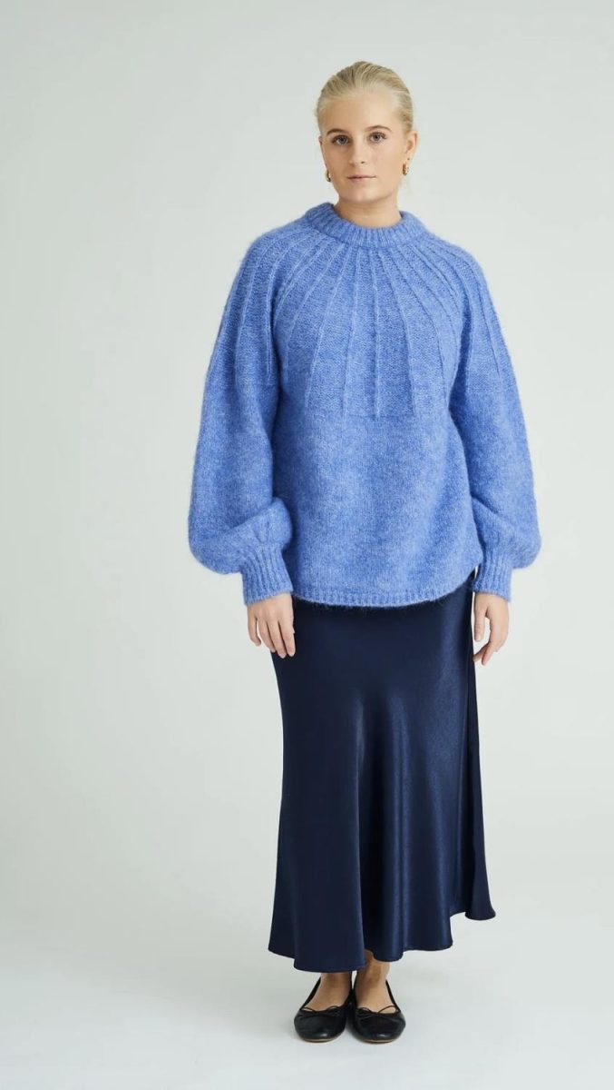 A-VIEW Carry Sateen Skirt Navy. Midilangt skjørt i marineblått, laget i viskoseblanding. Skjørtet har en svakt a-linjet passform og strikk i midjen. Kombiner med en deilig strikkegenser til hverdags, eller en pen topp til festligere anledninger.