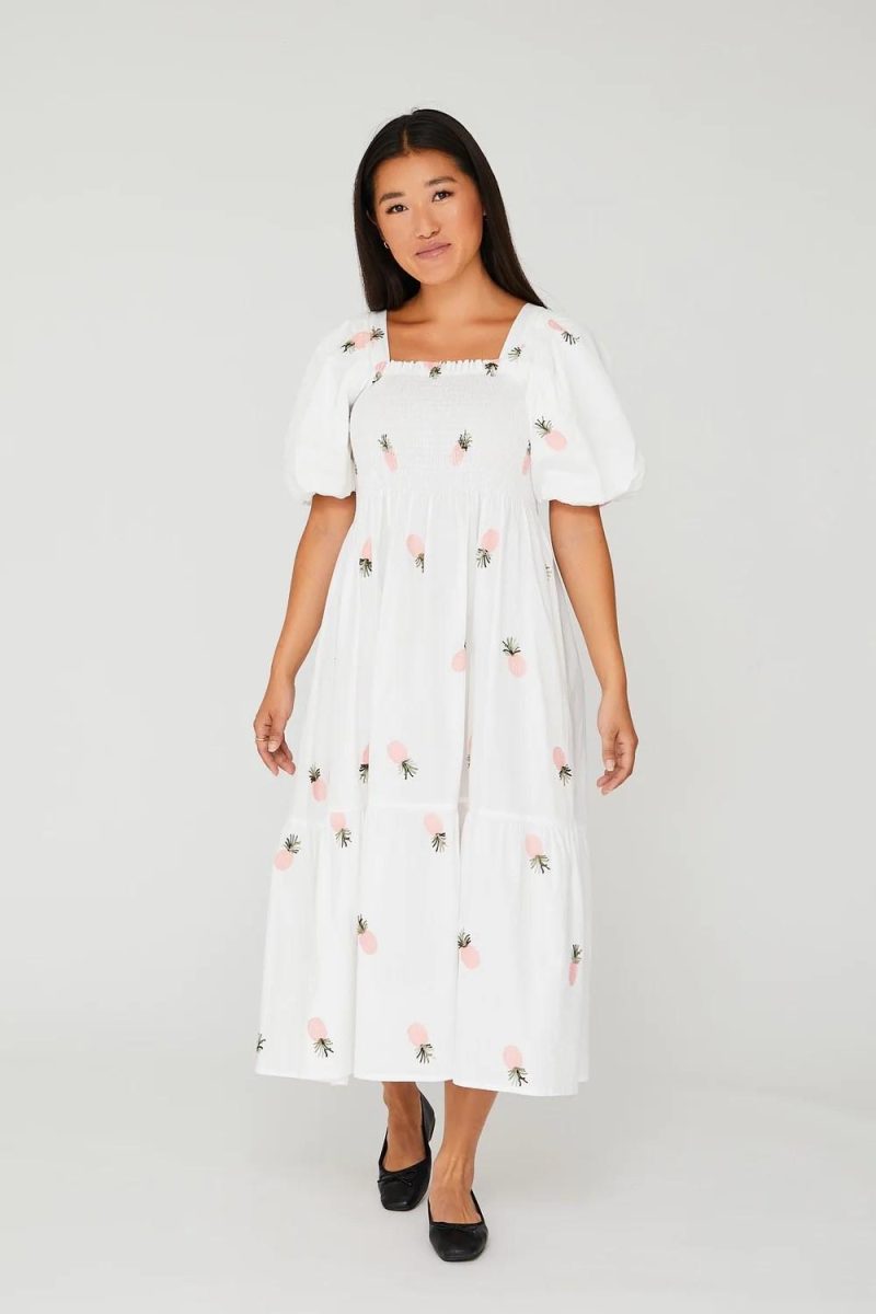 Cheri fruit dress er en lang, løstsittende kjole med print. Kjolen har voluminøse armer. Den har også en lang peplumdetalj nederst.