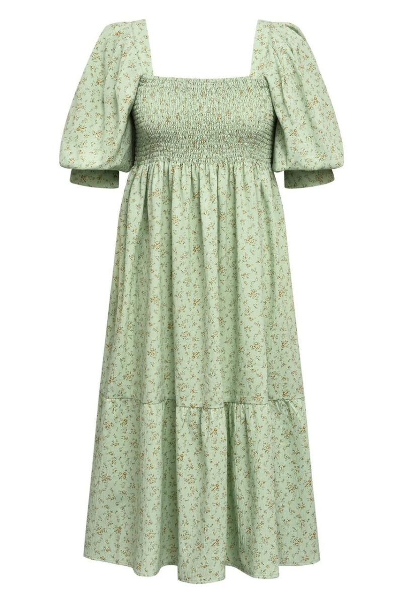 En helt magisk drøm av en sommerkjole. Herlig dus grønnfarge med behagelig småblomstret mønster.