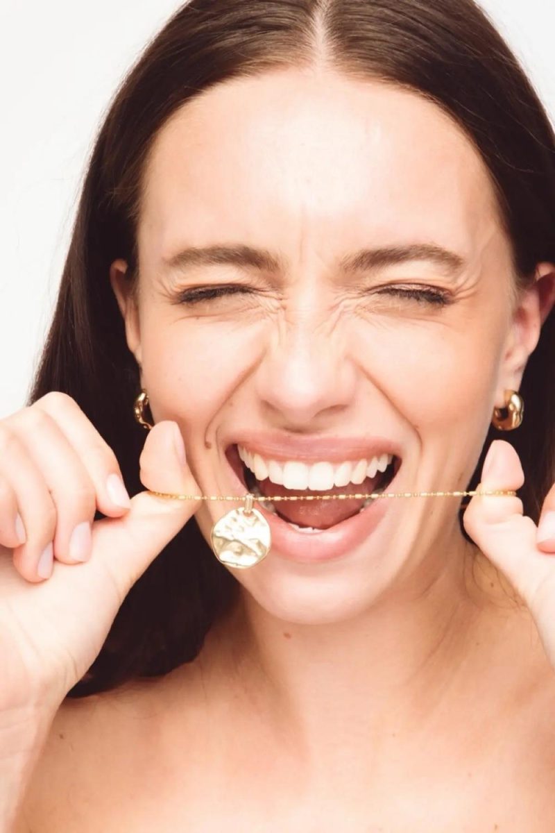 En rund medaljong med en organisk hamret overflate, laget i 14K gull PVD-belagt rustfritt stål. Et delikat og sjarmerende tilbehør.