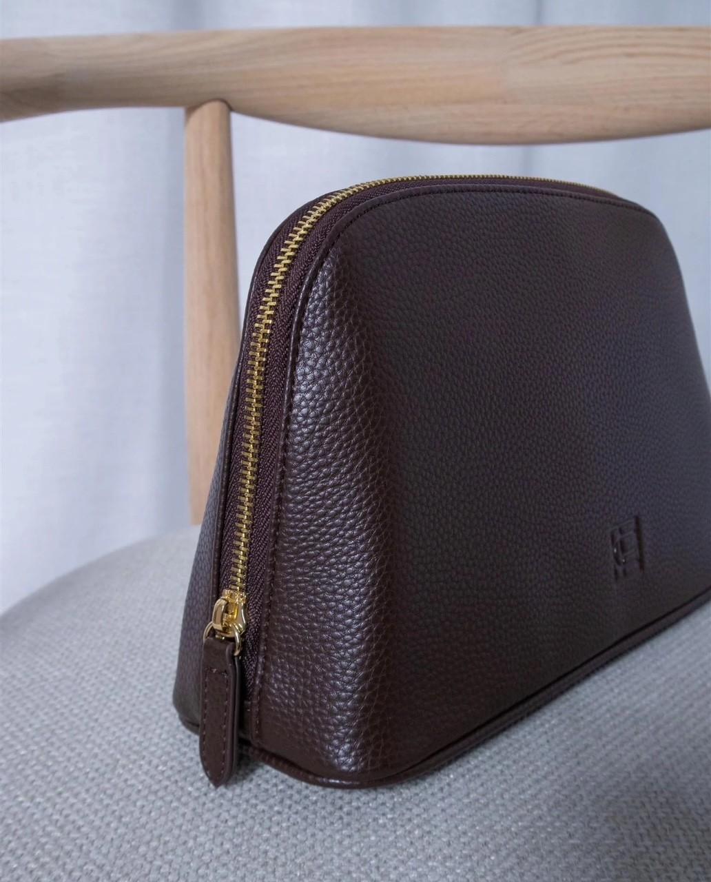 En elegant, mørkebrun kosmetikkpung med kornet tekstur.