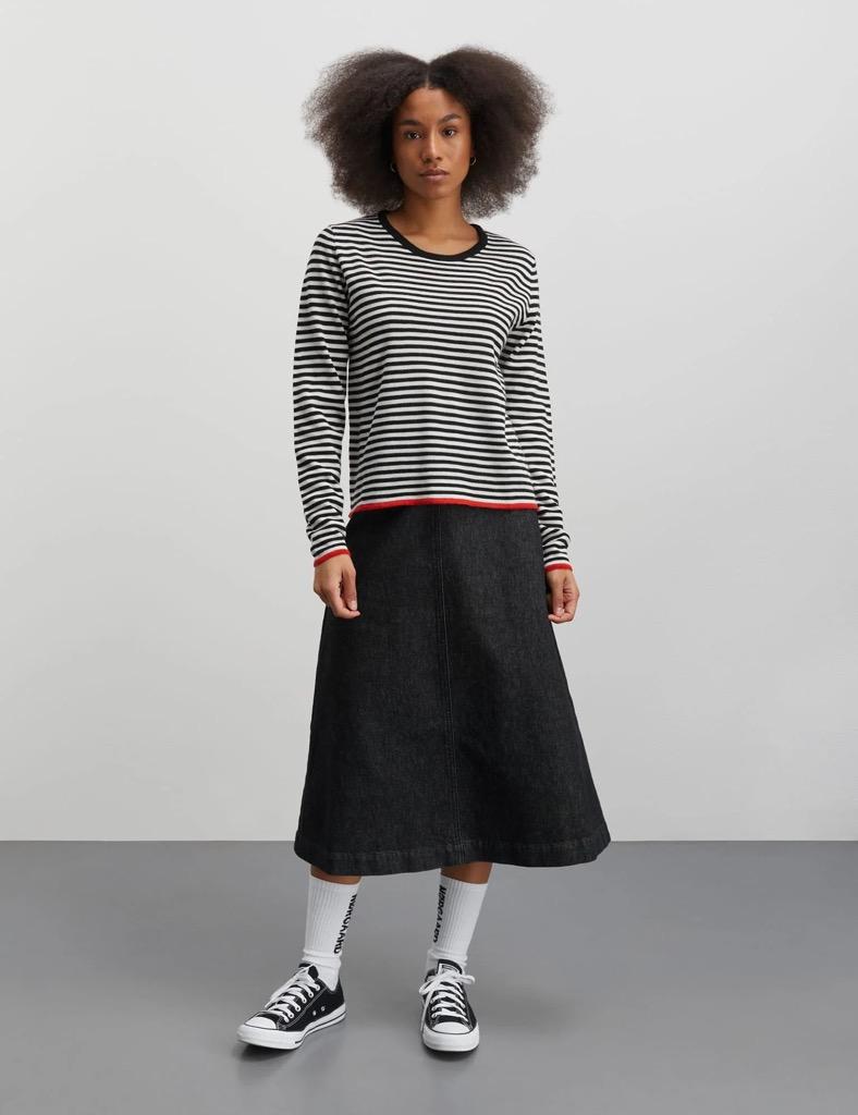 Det kuleste skjørtet fra Mads Nørgaard. Skjørtet er i myk denimkvalitet og går ut i A-snitt. Bak er det en skjult glidelås, så den er lett å hoppe i. Kul å style med en ensfarget hvit t-skjorte.