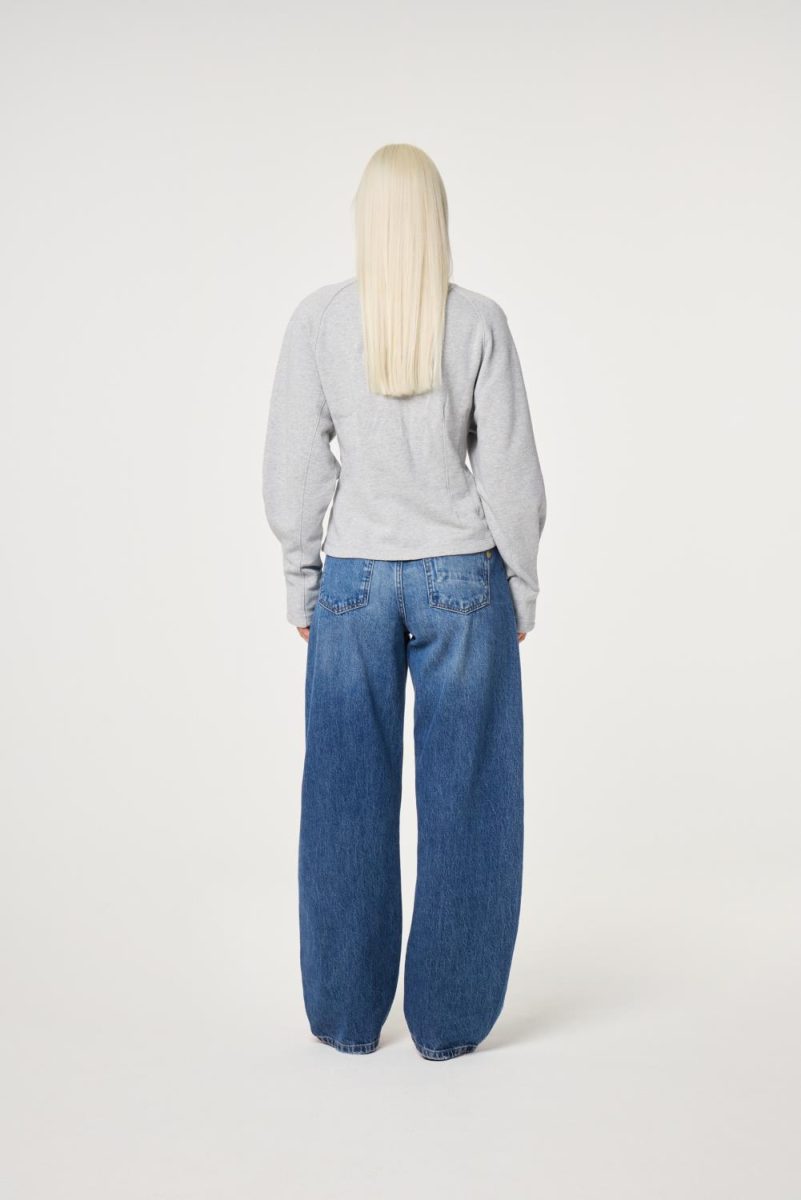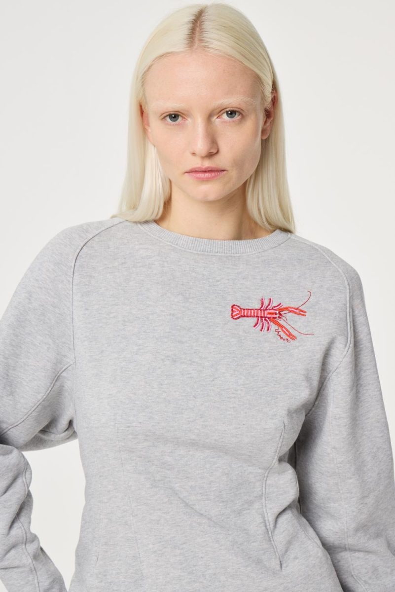 College genser med brodert trykk på venstre side. Genseren har en innsvinget fasong og rund hals.