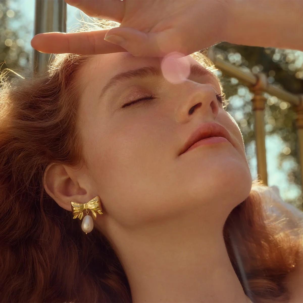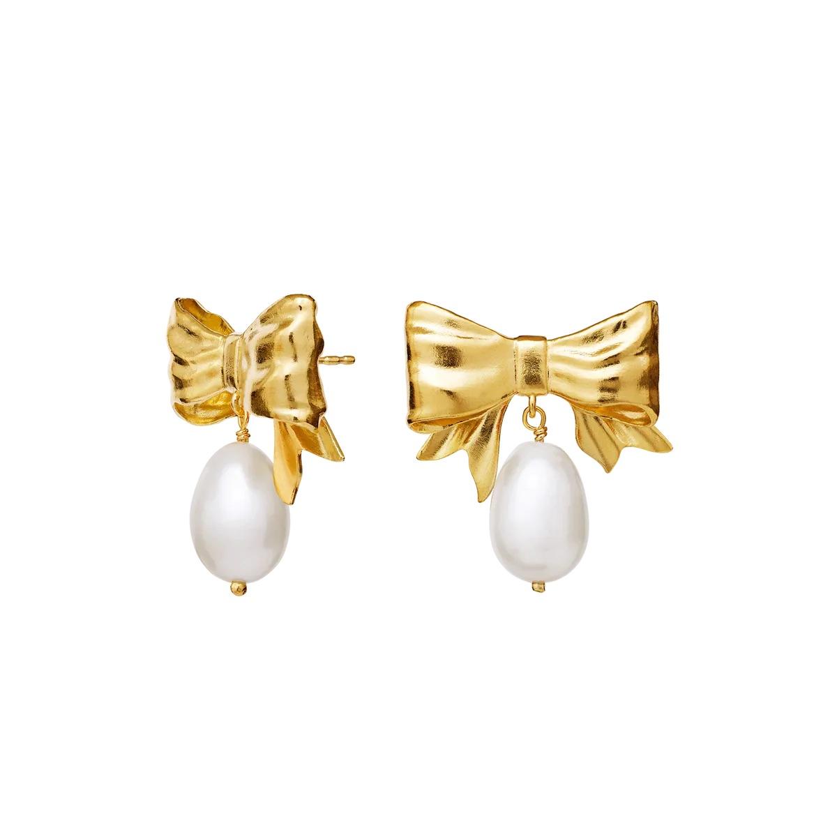 Diana-øreringene er prydet med ferskvannsperler som svaier elegant under sløyfens gylne bånd.