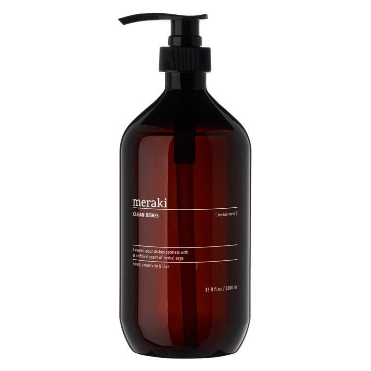 Oppvaskmiddelet Herbal Nest fra Meraki er svanemerket og har en mild urteduft med toner av salvie, sitrus og musk. Oppvaskmiddelet kommer i en fin pumpeflaske, som kan stå fremme på kjøkkenet hele tiden. Vakkert design og funksjonalitet er kombinert i denne flasken, som gjør det lett å måle opp riktig mengde oppvaskmiddel, avhengig av hva du trenger å vaske. Nyt det myke skummet, vitende om at du trenger bare litt såpe til en god oppvask. Bruk 2 ml oppvaskmiddel til 5 liter vann. Oppvaskmiddelet må ikke brukes i oppvaskmaskinen.