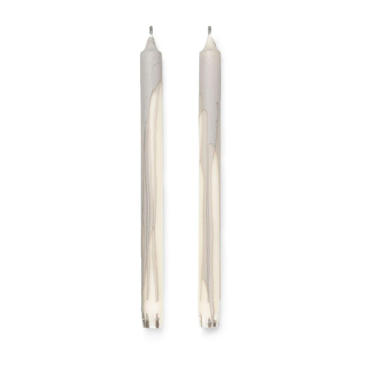 Dryp stearinlys 2-pakning laget av stearin med hvit base og en hånddryppet kontrastfarge.
