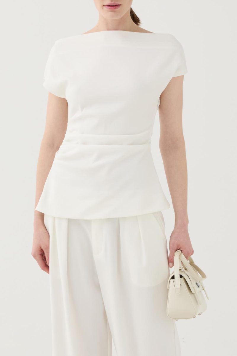 Lekker bluse med båt hals og draperinger på høyre siden.