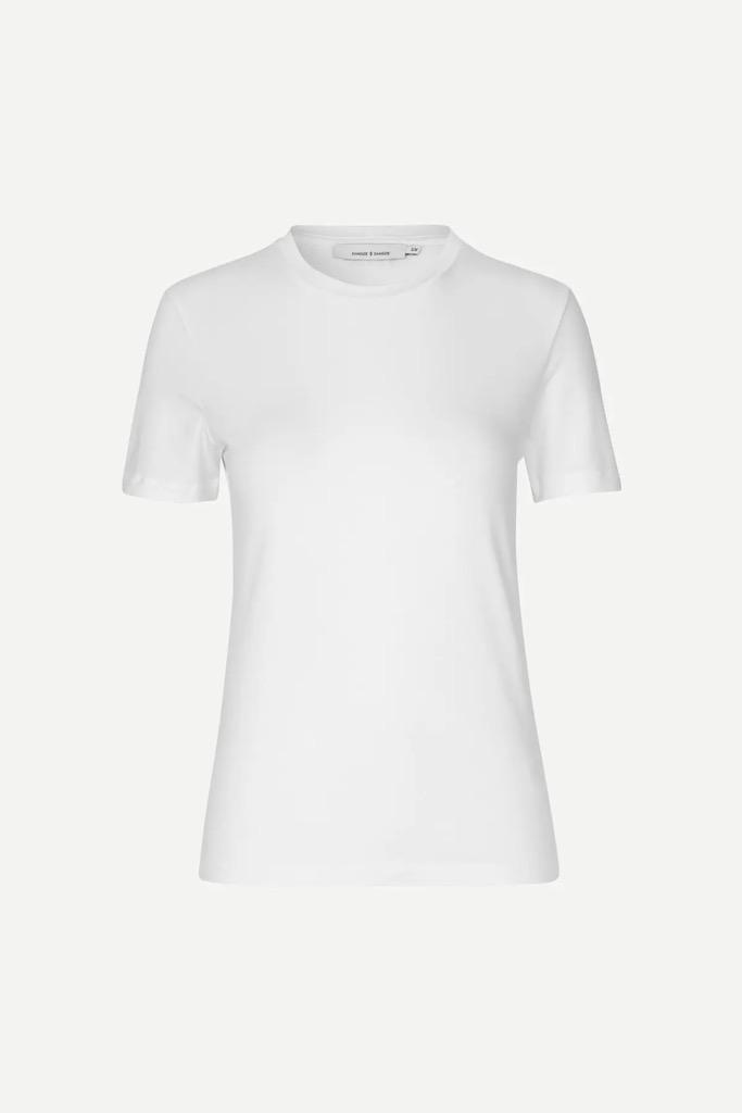Ester SS fra Samsøe Samøe er en kortermet T-skjorte laget av et stretch-jerseystoff med myk bomull og modalfibre. Den har smal passformen, pen rund hals og litt lengre erme