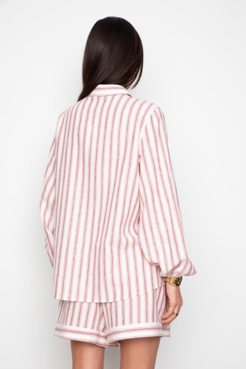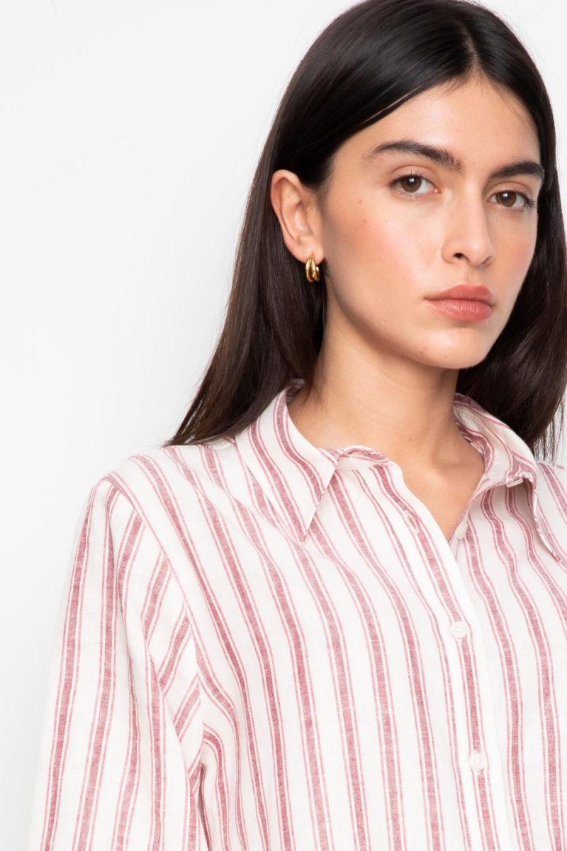 Fable Shirt fra Camilla Pihl er en lett og luftig skjorte med en avslappet passform, perfekt for varme dager. Den er laget i en myk blanding av lin og rayon som gir en behagelig følelse mot huden, og gjør den til et must-have i sommergarderoben. Den hvite bunnfargen kombinert med de delikate stripene i berry farge gir et friskt og feminint uttrykk. Skjorten har klassisk krage og knappelukking i front, samt voluminøse ermer med elastiske mansjetter som tilfører en moderne og avslappet silhuett. Perfekt å style alene eller sammen med matchende shorts for et gjennomført sommerantrekk. En allsidig skjorte som kombinerer komfort og stil på en elegant måte.