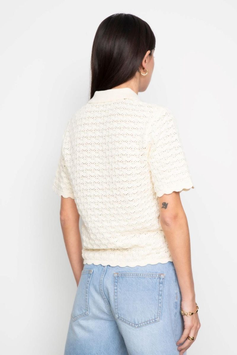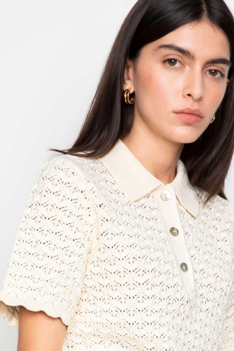 Gwen Knit Tee fra Camilla Pihl. En kortermet pologenser i en myk bomullsblanding med sesongens heklemønster. Den har tre knapper i front som gir et klassisk uttrykk med en moderne vri. Et tidløst plagg som enkelt kan styles til både hverdag og mer oppkledde anledninger.