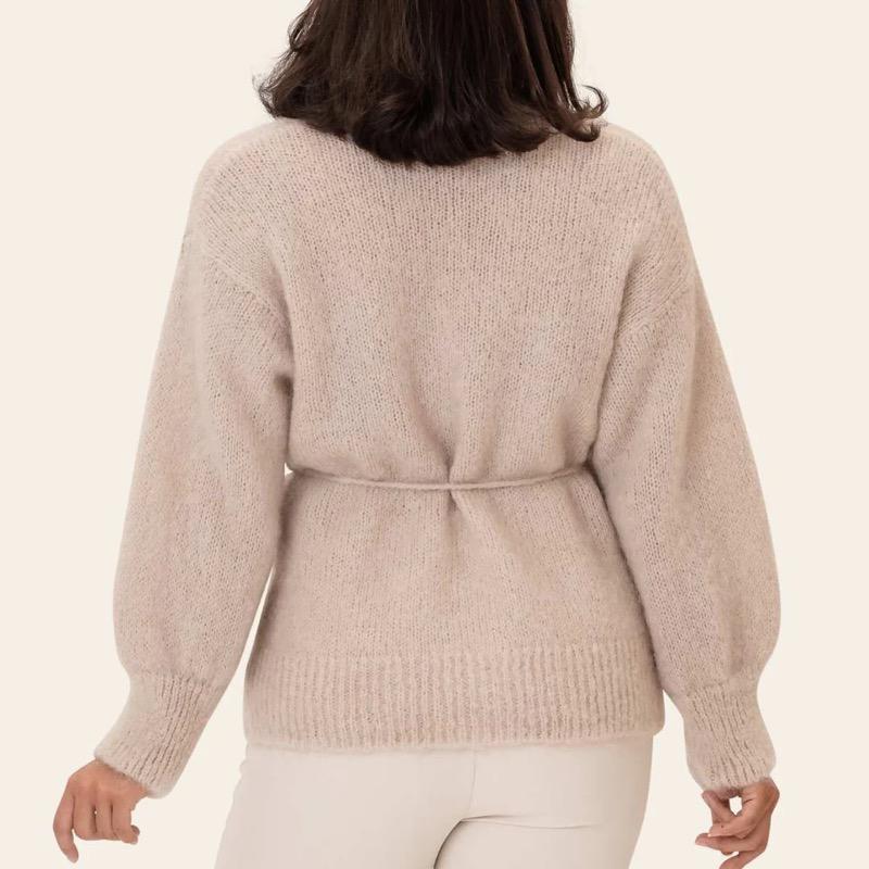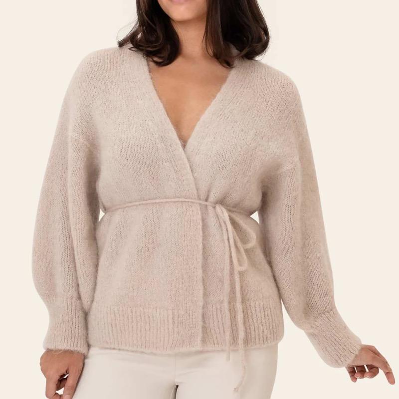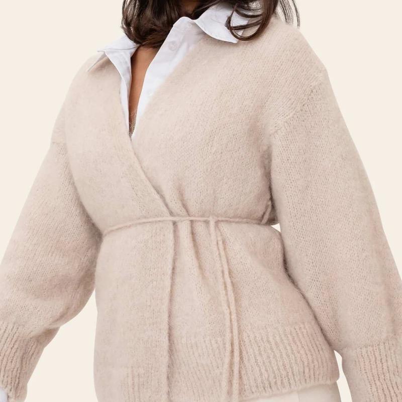En myk cardigan laget av en luftig ullblanding. Denne stilen er inspirert av BYIC sin populære IdaIC Cardigan, gjenskapt i et elegant omslagsdesign. Den knytes i midjen med et matchende belte, som fremhever figuren og skaper en feminin silhuett. De lange, lett ballongformede ermene og den dype V-halsen gir den et avslappet, men likevel raffinert utseende.