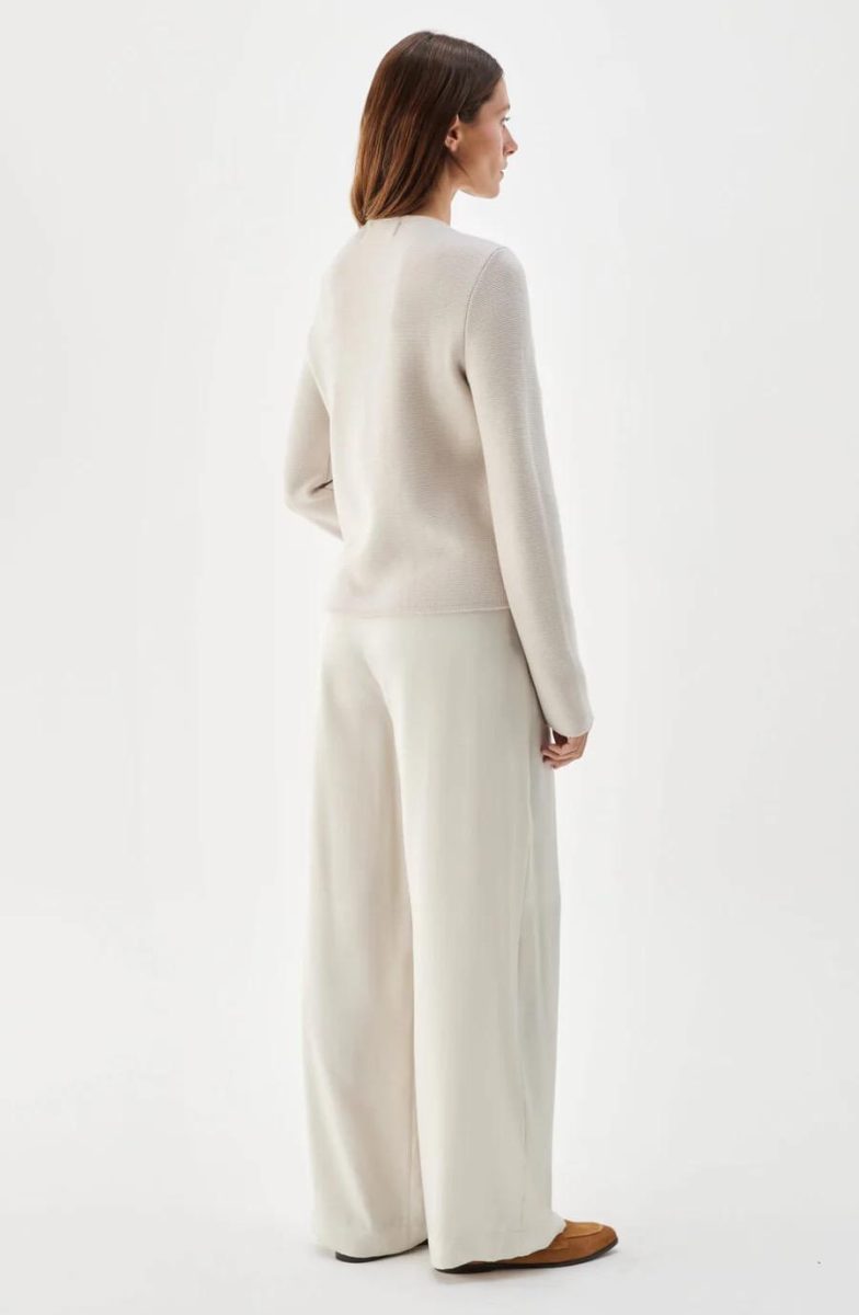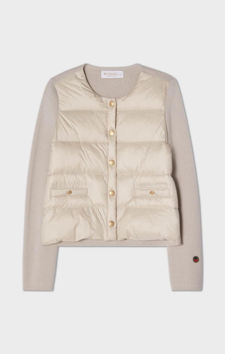 Iva er en hybrid mellom en lett dunjakke og en strikkejakke, laget med nylonfront fylt med dun og myke merinoull-ermer og rygg. Foran finnes trykknapper i gulltone på lukking og lommer, som gir et elegant preg samtidig som jakken holder deg varm på kalde kvelder.
