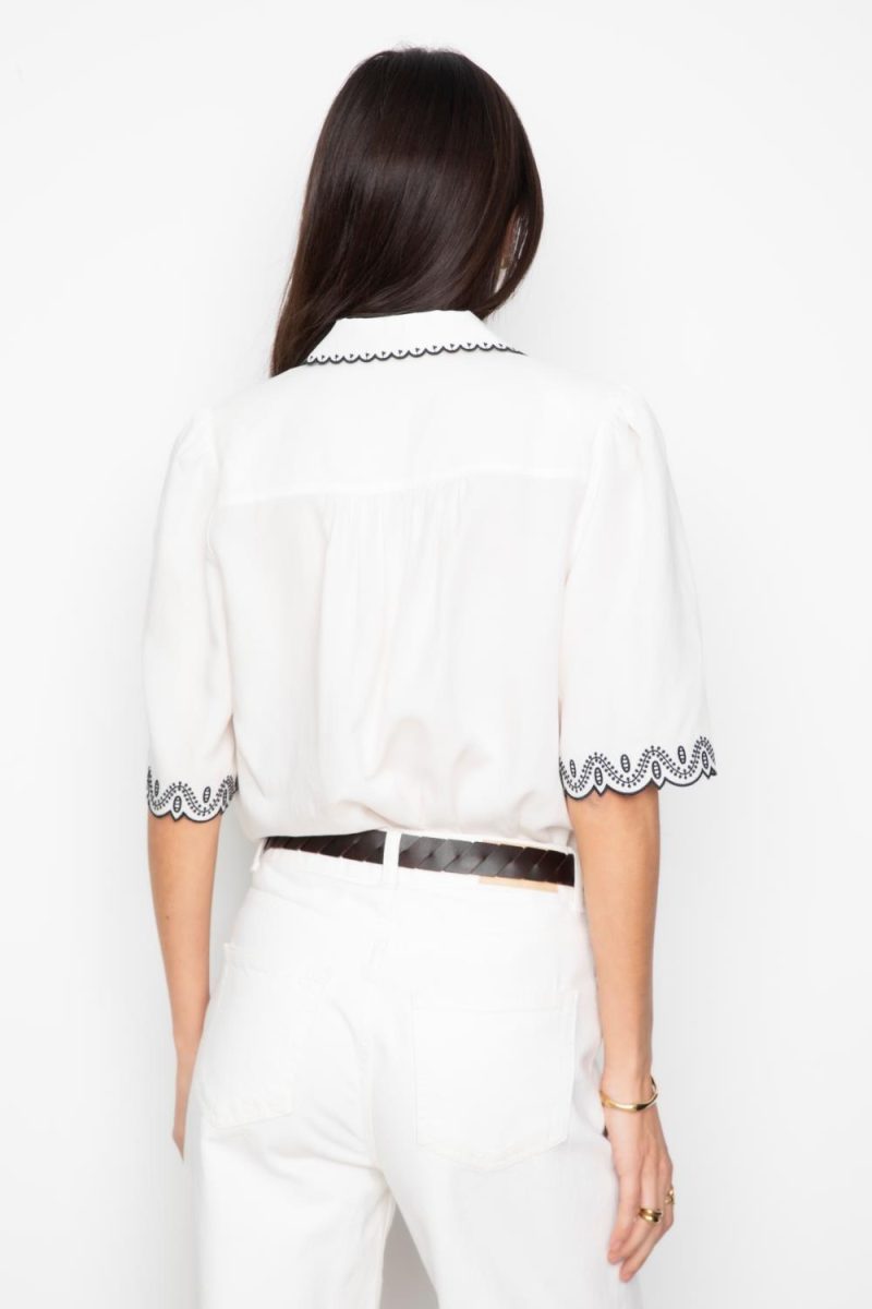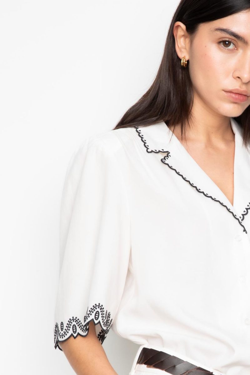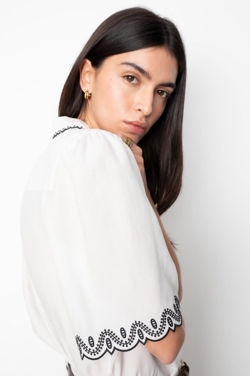 Jane Blouse er laget i et lett og delikat blanding av tencel og lin. Blusen har broderte detaljar langs krage og ermeopning, avslappa passform og knappestolpe i front. Ryggbærestykke gir ekstra volum, medan slagkrage og diskrete skulderputer fullfører uttrykket.