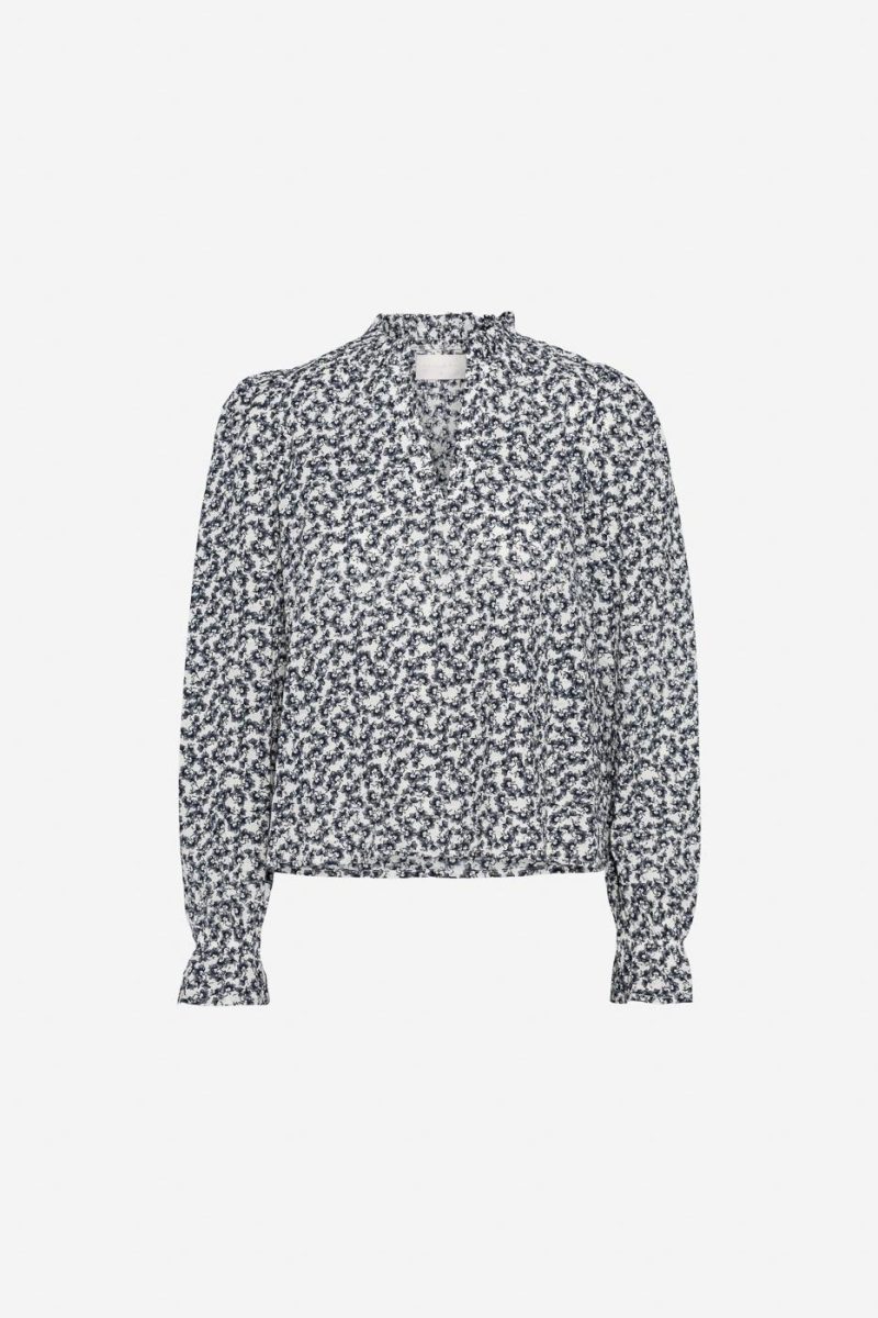 Jenny Blouse fra Camilla Pihl. Vakker bluse fra Camilla Pihl med et sjarmerende blomsterprint i blåtoner. Jenny Blouse har lange ermer med puff på skuldrene og smal mansjett, og er laget i lett crepe. Blusen har liten rysjekant i halsen i halsen med V-hals og rett passform.