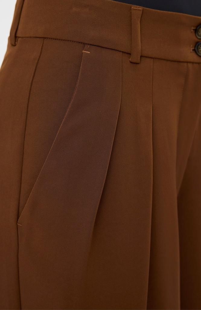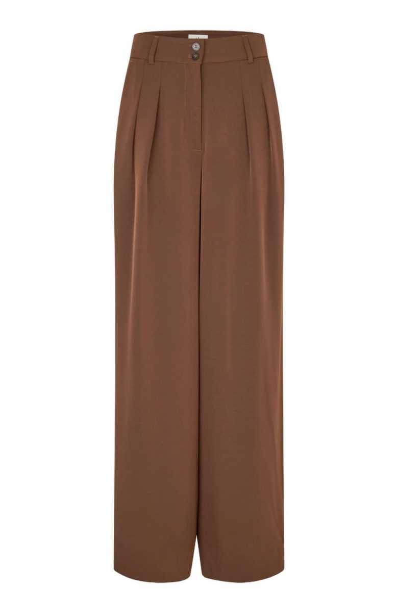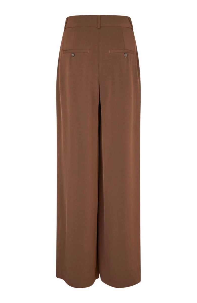 KarenFV har høy midje med dobbel knappelukking og er skåret i en generøs silhuett med vide ben som følger dine kurver. Det allsidige designet er minimalistisk detaljert med beltehemper, sidelommer og passpolerte baklommer med knapper. Folder foran gir dem et skreddersydd utseende. Designet i København.