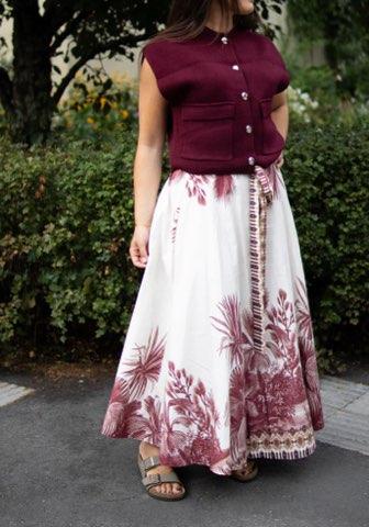 Et nydelig skjørt med mye stoff som faller utrolig fint. Skjørtet har strikk bak i livet og knyttebelte.
