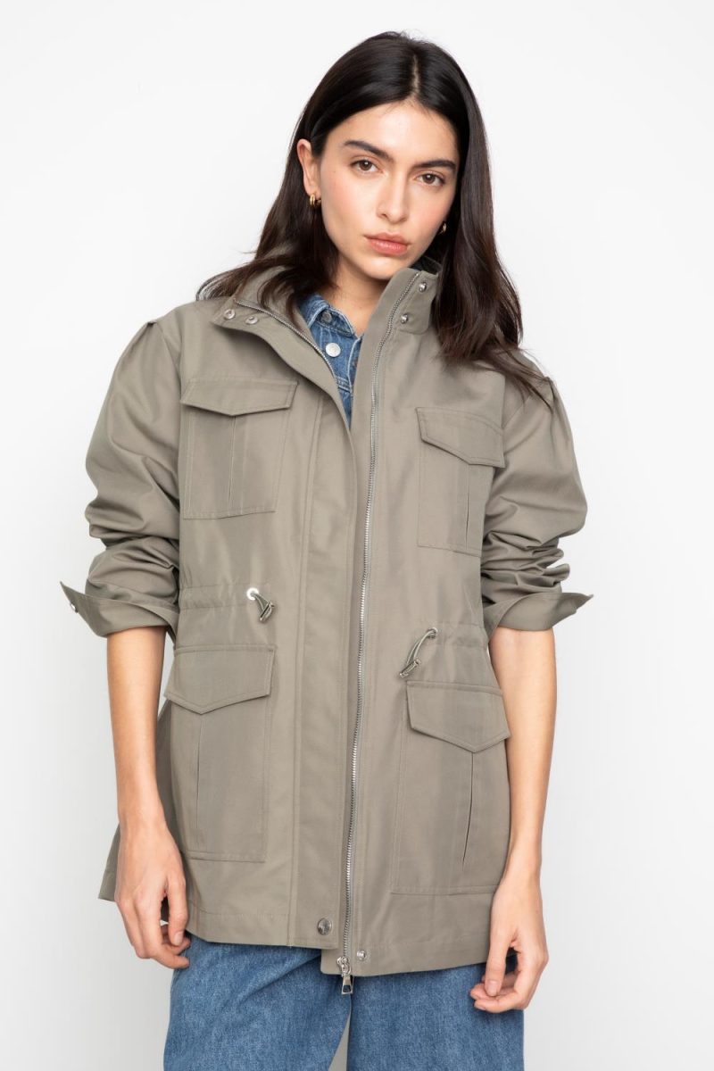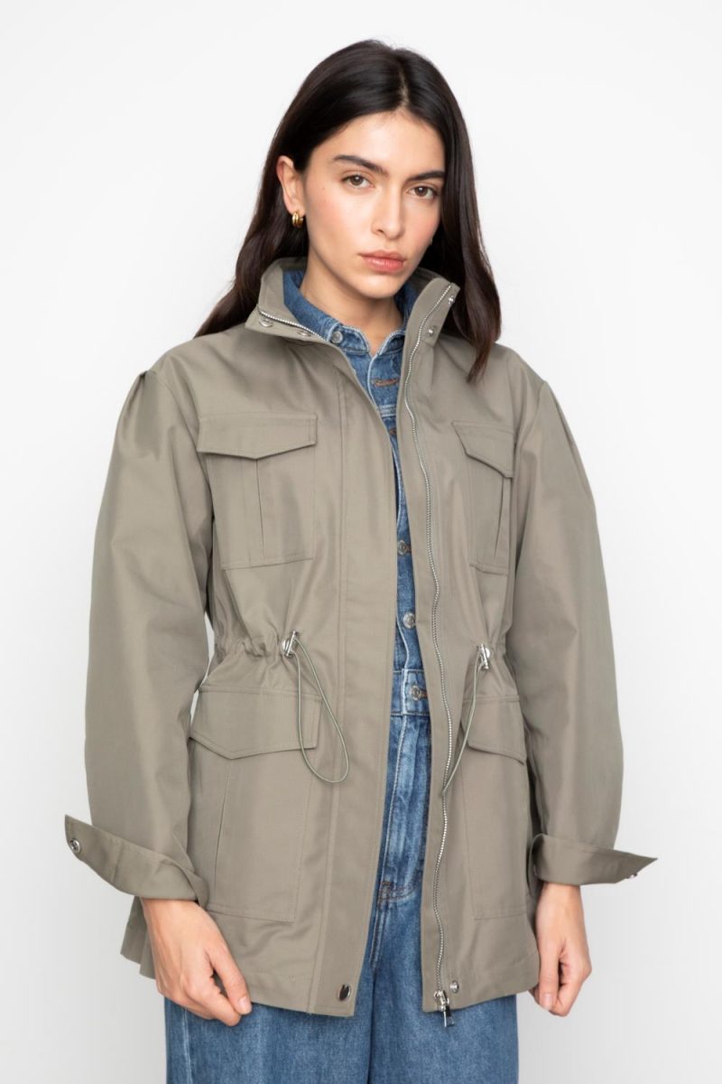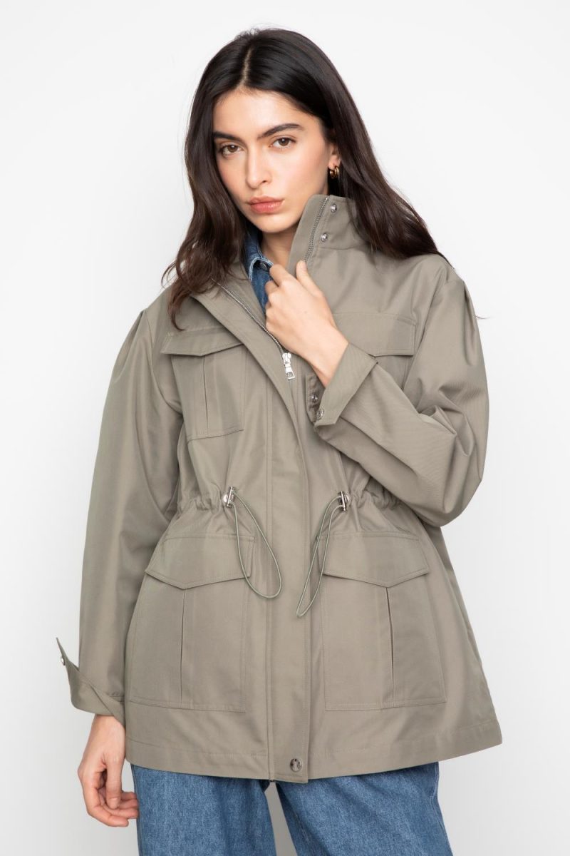 Madiana-jakken er et funksjonsinspirert plagg laget av en vannavvisende bomullsblanding, perfekt for våren. Den er designet for en avslappet passform, og har en justerbar snøring i midjen for å skape en flatterende silhuett. Jakken er utstyrt med lommer med klaff, en skjult glidelåsstolpe og trykknapper. En bred leggdetalj på skuldrene gir et særegent preg. Den er ferdig med en Bionic Eco-finish.