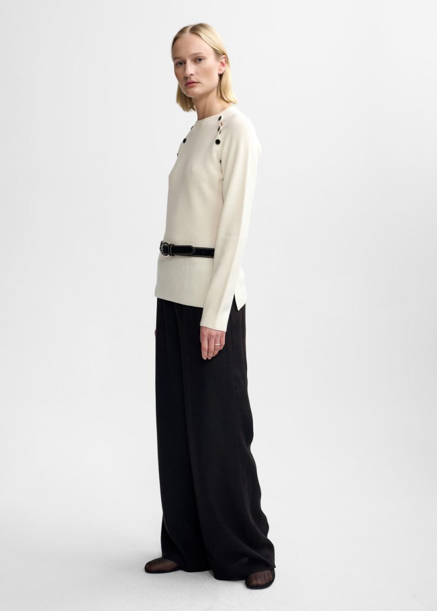 Genseren har lang arm, rund hals med knappedetaljer i sort og spitter i sidene.