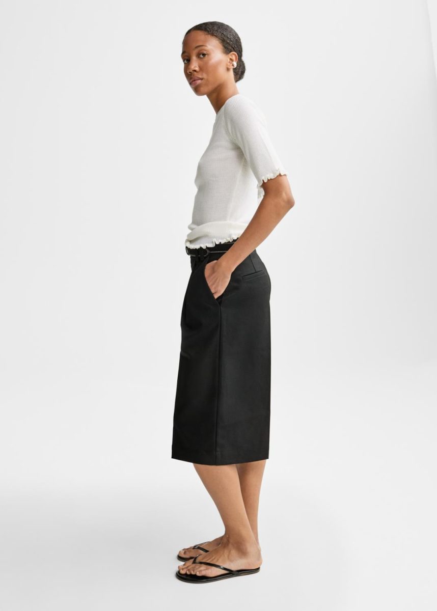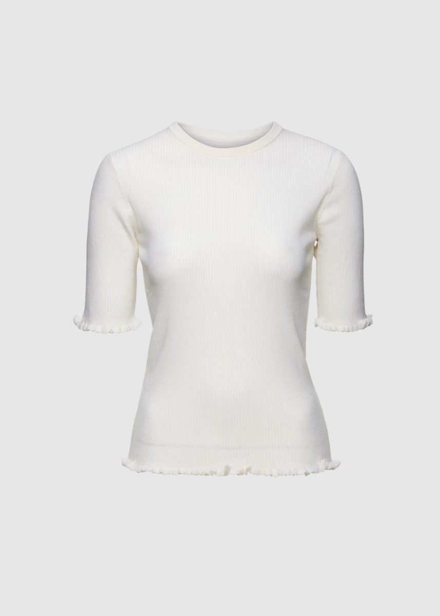 Milla Merino Knit er en ribbestrikket topp i myk merinoull, avsluttet med delikate volangdetaljer nederst og ved ermene.