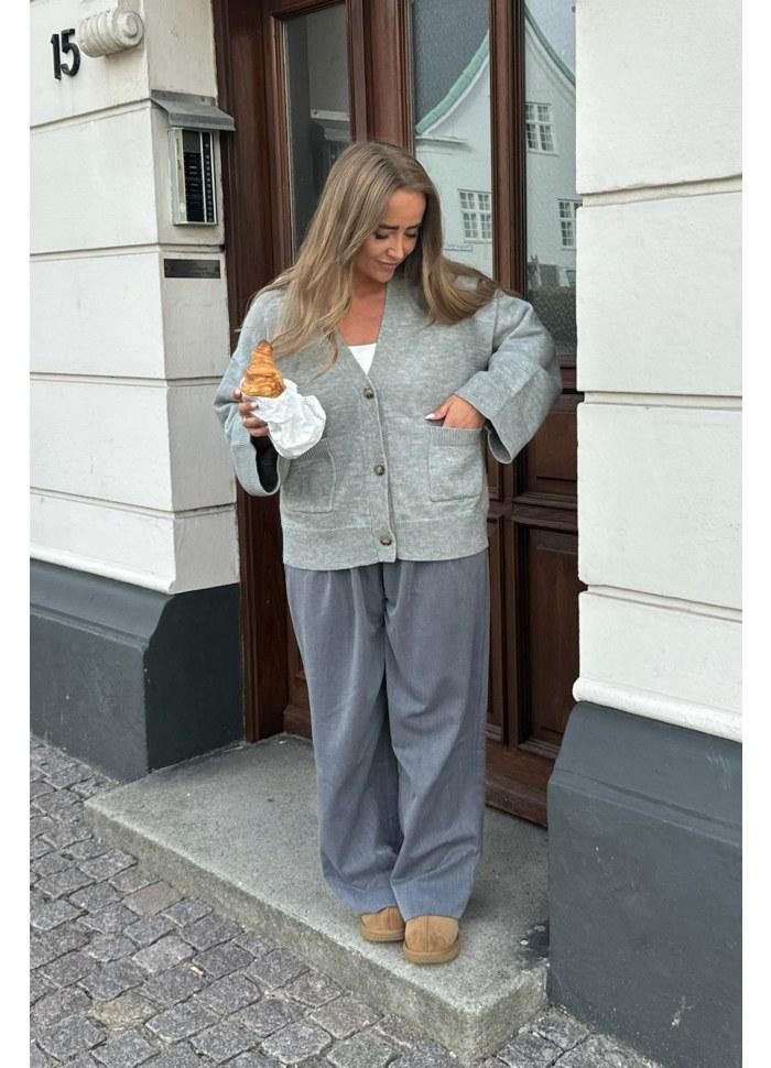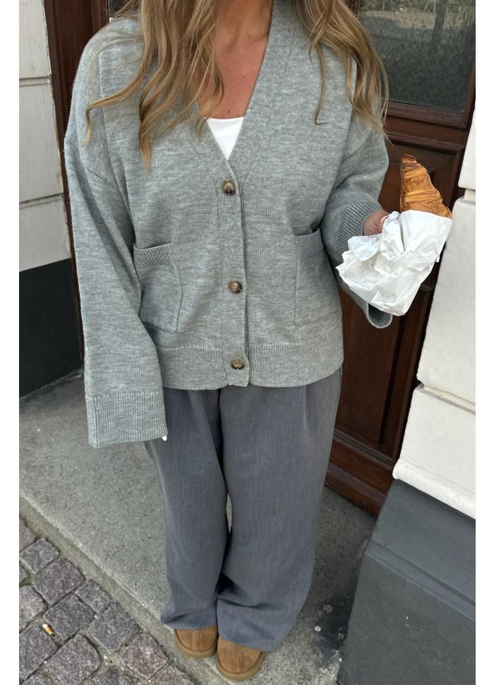 Myk boxy cardigan i ullblanding med ribbedetaljer. Den har to store lommer foran og tre knapper som lukking.