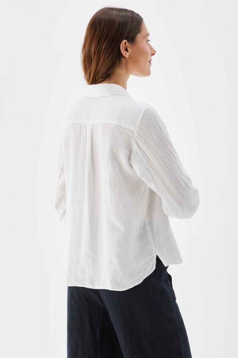Nenne long-sleeved linen shirt fra Busnel er laget i myk og pustende lin som gjør den til et naturlig valg for varmere dager. Skjorten har lange ermer, klassisk krage og elegante gullknapper som gir et raffinert uttrykk. Krage og mansjetter i glatt bomull skaper en subtil og eksklusiv kontrast til linens struktur. Bruk den sammen med Busnels linbukser eller linshorts for et gjennomført sett – eller style den med denim for en mer avslappet, men fortsatt velkledd look.