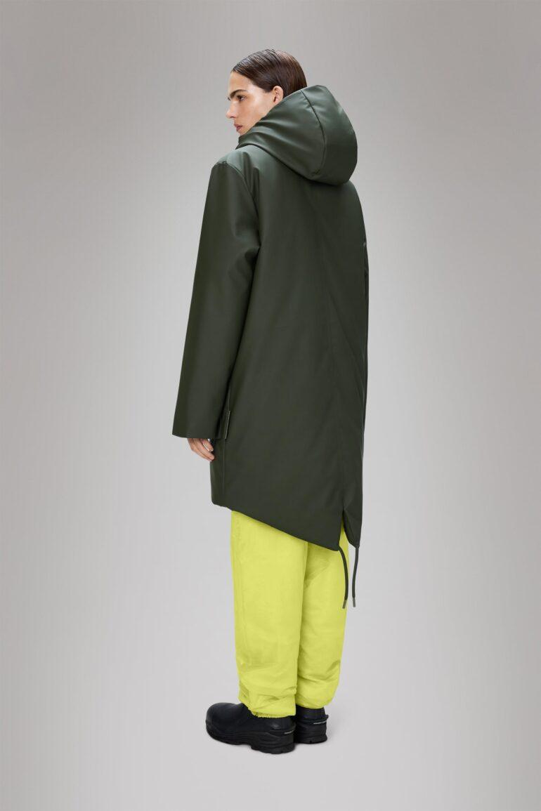 Den vanntette jakken er laget av Rains’ signatur PU-stoff med en sterk og slitesterk vevd bakside. Finishen er ren med et skarpt utseende og en glatt følelse.