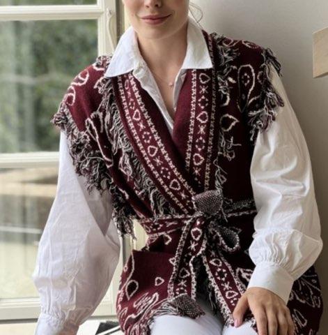 En flott mønstrete vest, med frynsekanter og knytebelte i livet som gir en avslappet, men sofistikert silhuett. En anvendelig favoritt i garderoben utover hele høsten og vinteren