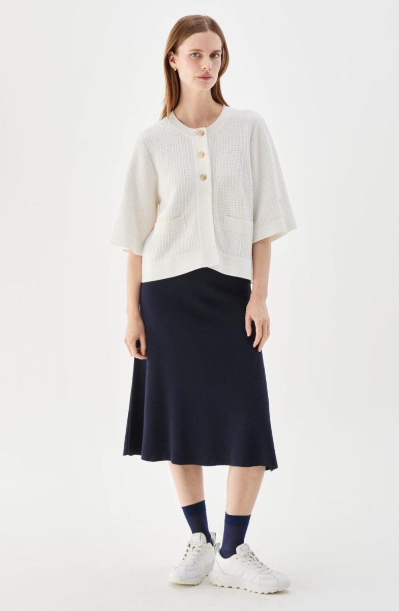 Cardiganen har en rund utringning i halsen med tre gullknapper nedover, den har en rett og kort passform og vide albue-lange ermer. Dette gjør den perfekt over en kjole, bluse eller lignende hvor man gjerne vil vise litt mer av plagget under.