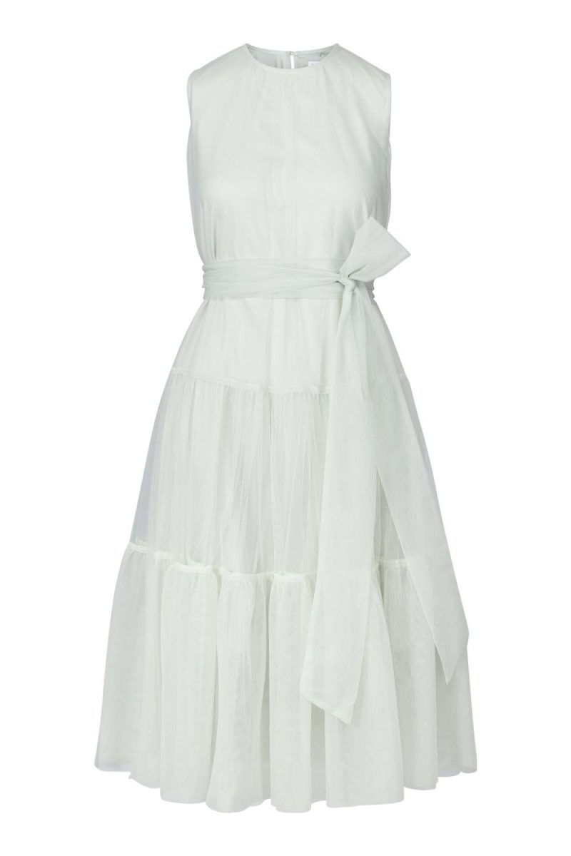 Volumiøst A-formet peplum kjole laget i flere lag tyll. Kjolen har nøkkelhullsåpning med knapp bak, mykt for av rayon og belte i samme tekstil.
