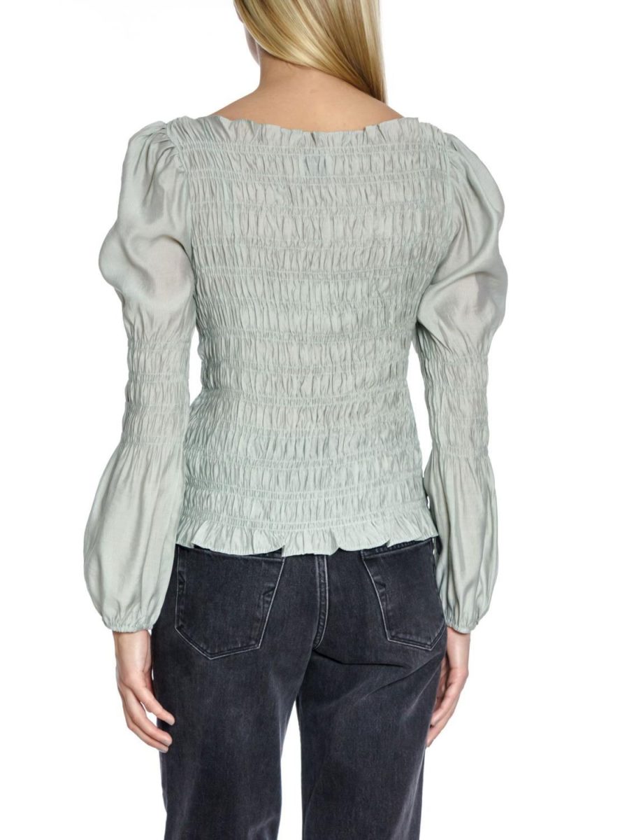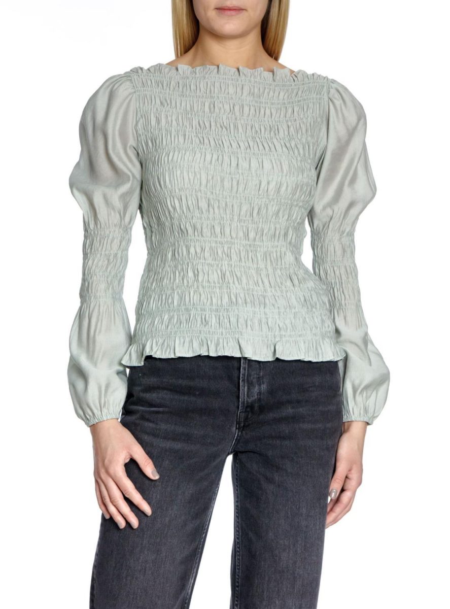 Polka-bluse fra Neo Noir. En nydelig topp med elastisk passform og smokkede detaljer. Blusen har bred hals, lange ermer og skreddersydd passform.