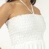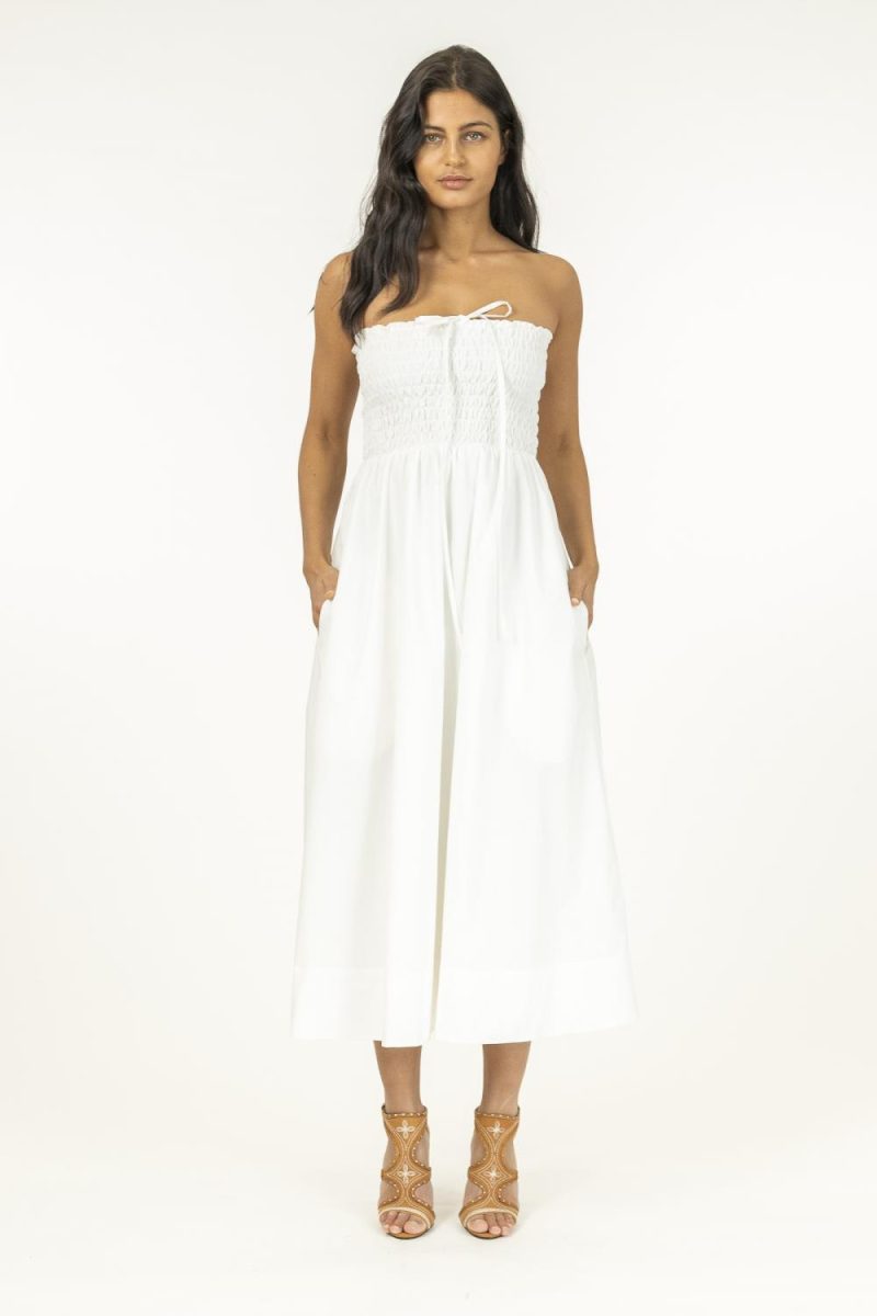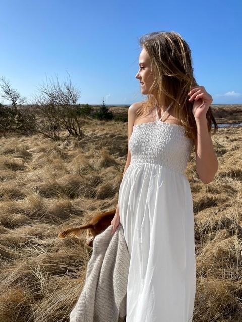 Ankellang kjole med elastisk plissert topp og lettvolumiøst skjørt laget i bomullspoplin. Kjolen har stropper, sidelommer og fastsydd oppbrett.