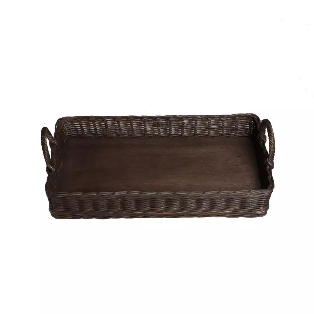 Lekkert og praktisk Kurvbrett. Sider og håndtak i brunfarget kurv, med bunnplate i brunt tre.