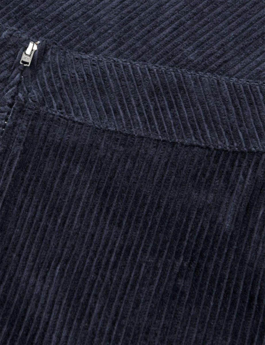 A-formet, knelangt skjørt med høy midje, fast linning og glidelås.