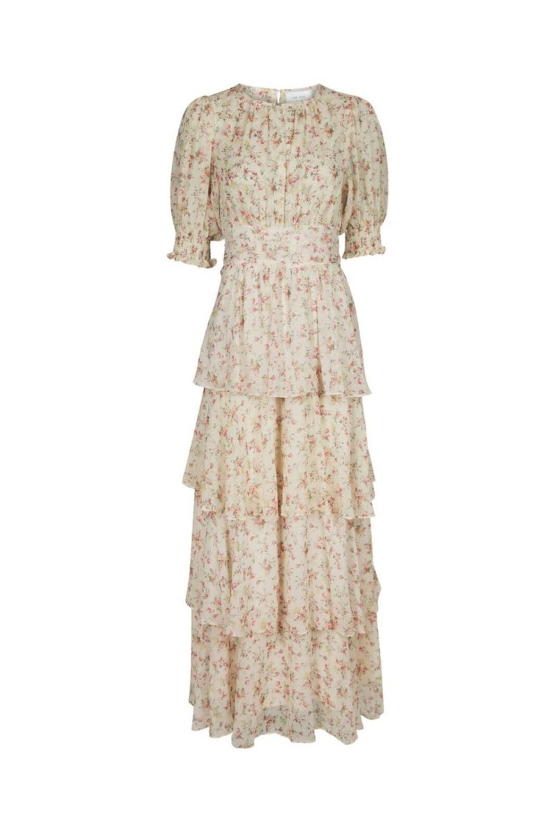 Sable Meadow Printed Dress fra Neo Noir er en vakker maxikjole som kombinerer romantisk design med tidløs eleganse. Kjolen har et delikat blomsterprint på en lys bunn og er laget i en lett og luftig kvalitet som faller pent. Den feminine silhuetten fremheves av en elastisk smock-midje og et langt skjørt med dekorative kapper som skaper nydelig bevegelse. Med sine korte puffermer og en diskret rund hals er dette kjolen som passer like godt til bryllupsgjesten som til sommerfesten. Style den med hæler for en pyntet look, eller sandaler for et avslappet sommerantrekk.