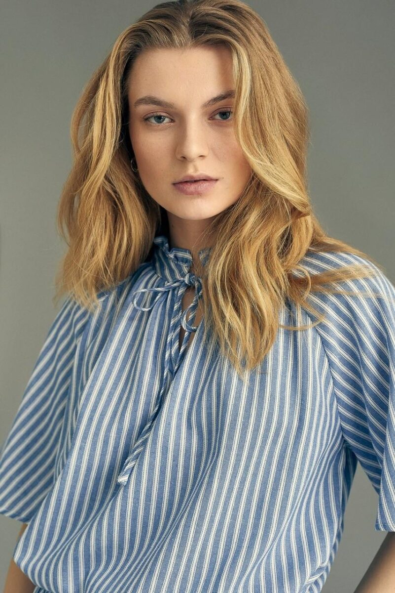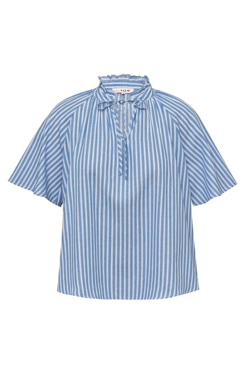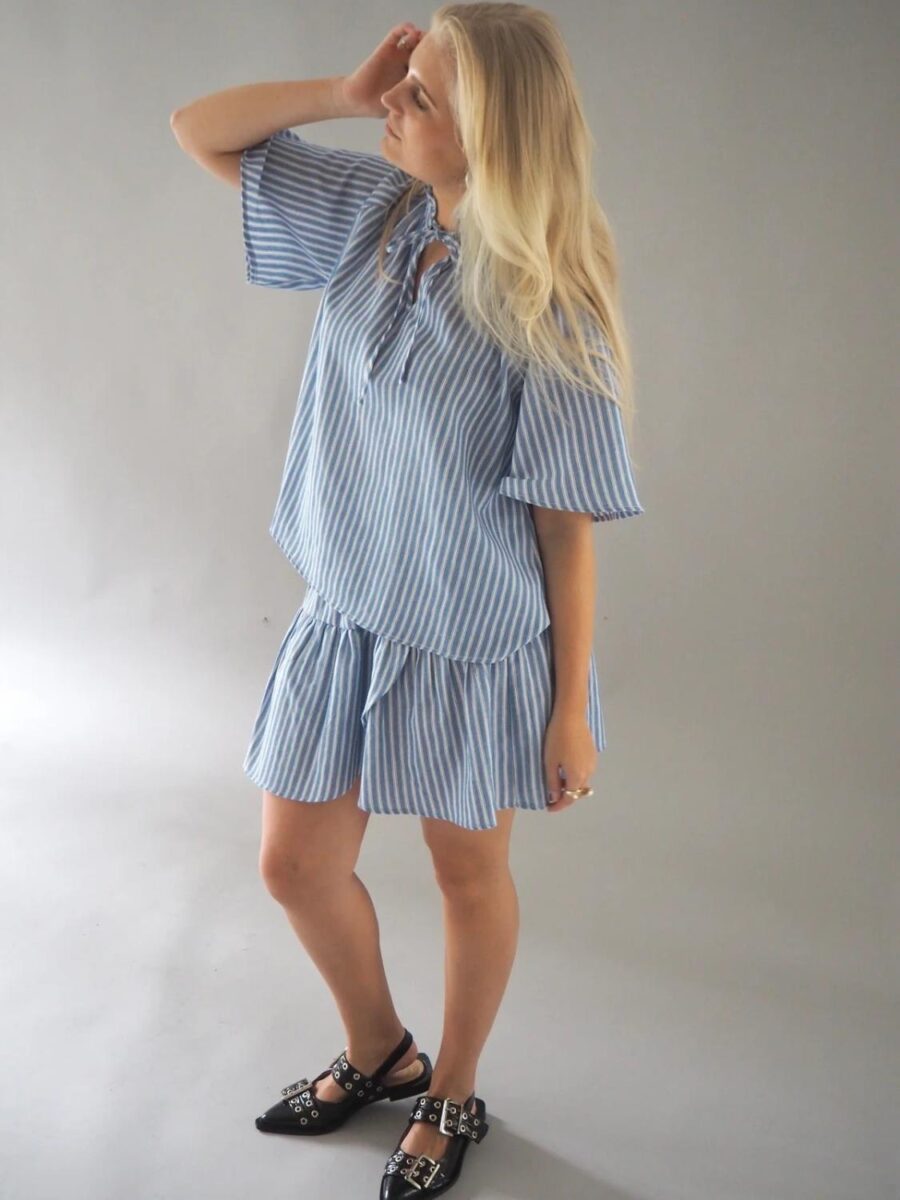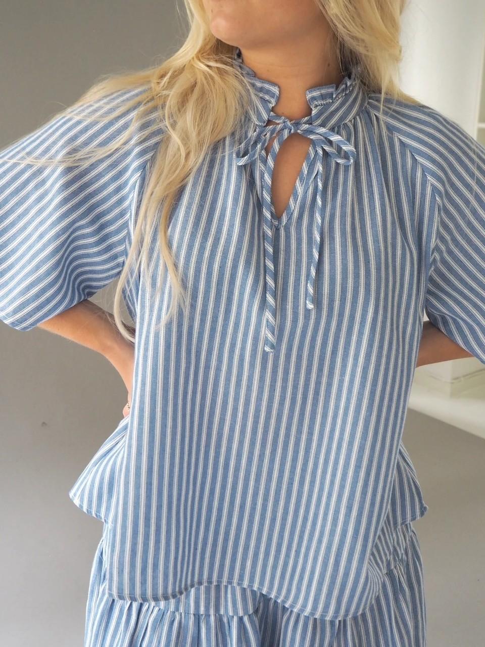 Safia blusen er en bluse med korte ermer og løs passform. Blusen har en liten volangkant og knytebånd i halsen.