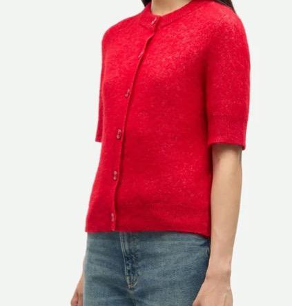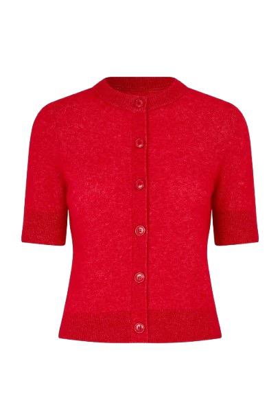 Kortermet cardigan med vanlig passform. Knappelukking foran. Ribbestrikket krage, mansjetter og fald. Rund hals.