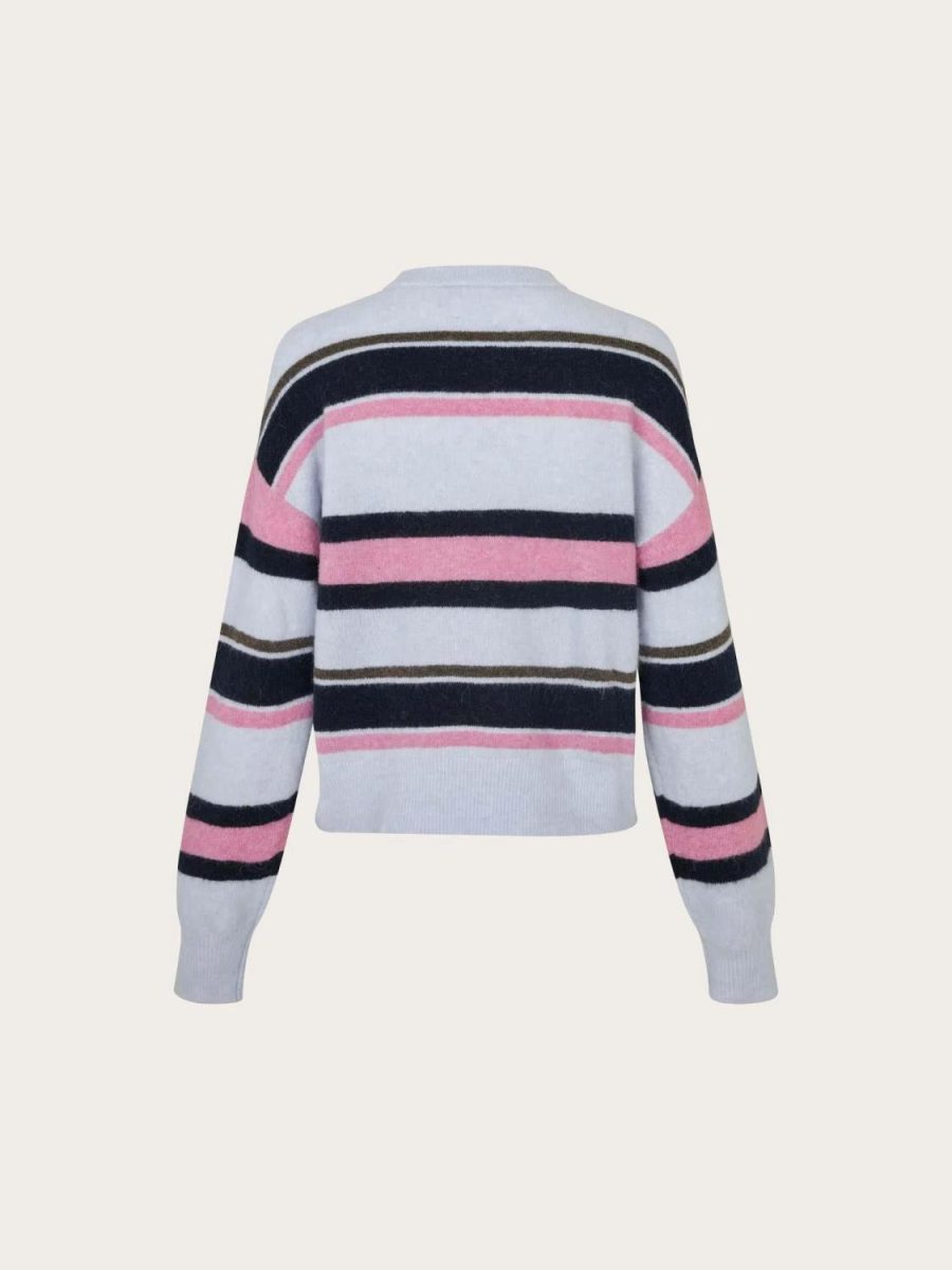 Genser med løs passform og lave skuldre. Ribbestrikket krage, mansjetter og fald. Rund hals. Børstet utseende. Stripet mønster. Hovedmateriale laget av en elastisk blanding av ull, alpakka og resirkulert polyamid.