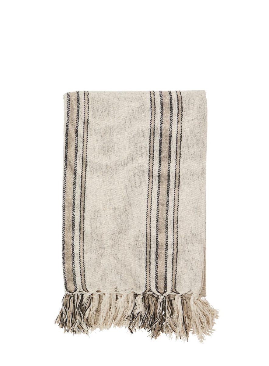 Striped woven throw w / fringes Ecru, black, sand