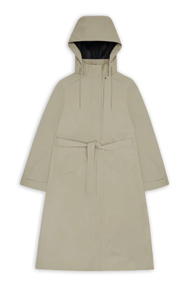 Suva Hardshell W Coat W3 fra Rains. Denne funksjonelle og elegante regnkåpen er designet for å tåle all slags vær, samtidig som den beholder en sofistikert stil. Kåpen har en feminin silhuett som kan fremheves med det avtakbare beltet i midjen. Den er utstyrt med en høy krage og en justerbar hette for optimal beskyttelse. Det vanntette materialet (10 000 mm vannsøyle) og de teipede sømmene sørger for at du holder deg tørr, mens den skjulte knappelukkingen og de romslige lommene gir et rent og minimalistisk uttrykk.