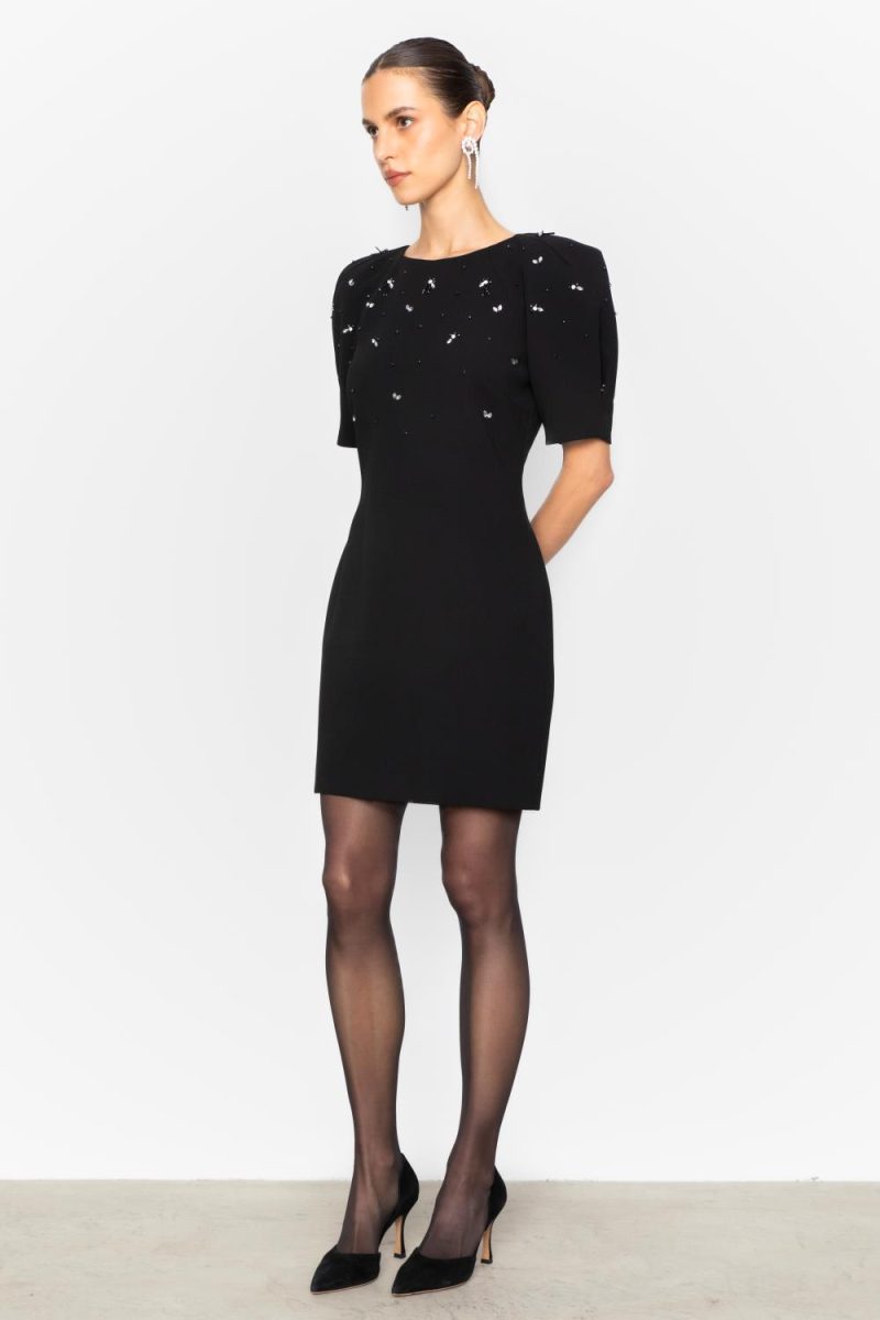 Tava dress fra Camilla Pihl er en stilren kjole med korte ermer som har iøynefallende dekorasjoner plassert øverst på overdelen, som tilfører et elegant og glitrende preg.