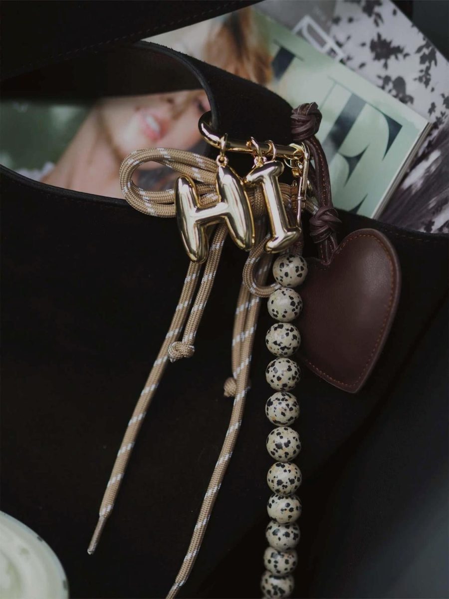 En slitesterk hjertecharm kombinert med en snorbue og en perlesnor. Et enkelt og dekorativt tilbehør som passer like godt til vesker som til nøkkelringer.