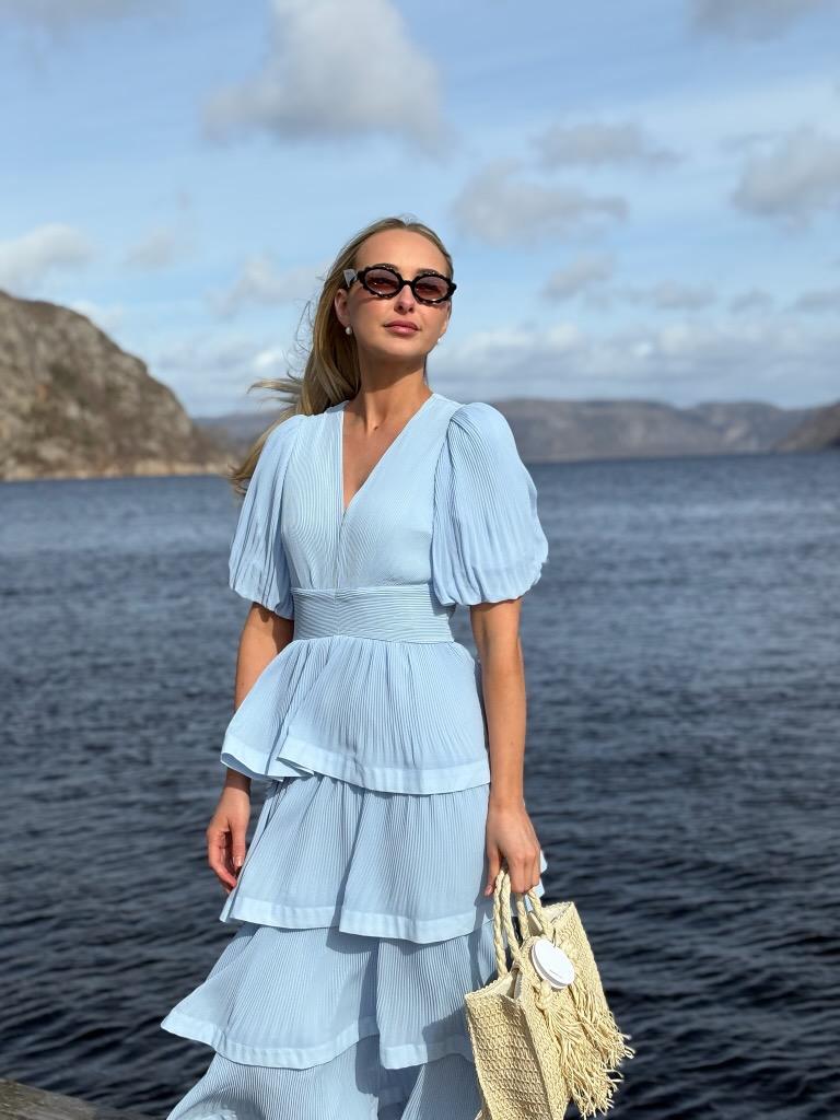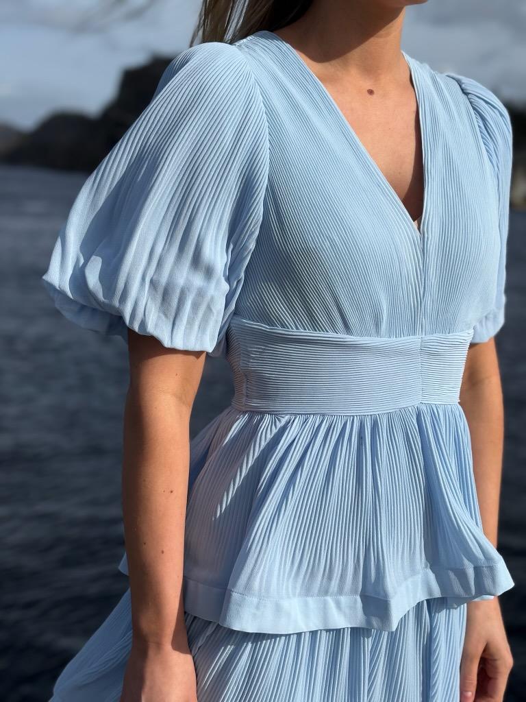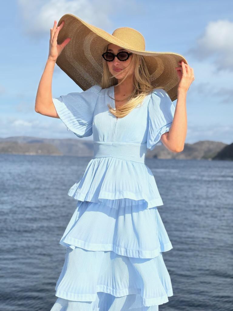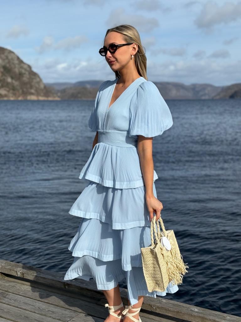Yasplira SS Long Dress fra Y.A.S er en romantisk, lang kjole. Sydd i lett, plissert chiffon av resirkulert polyester, med dyp V-hals, korte ballongermer og en bred, markert midje som former silhuetten. Skjørtet faller i flere lag med volanger for vakkert volum og bevegelse – perfekt for bryllup, konfirmasjon og sommerfester. Kjolen er helfôret for komfort og lukkes med skjult glidelås i ryggen.